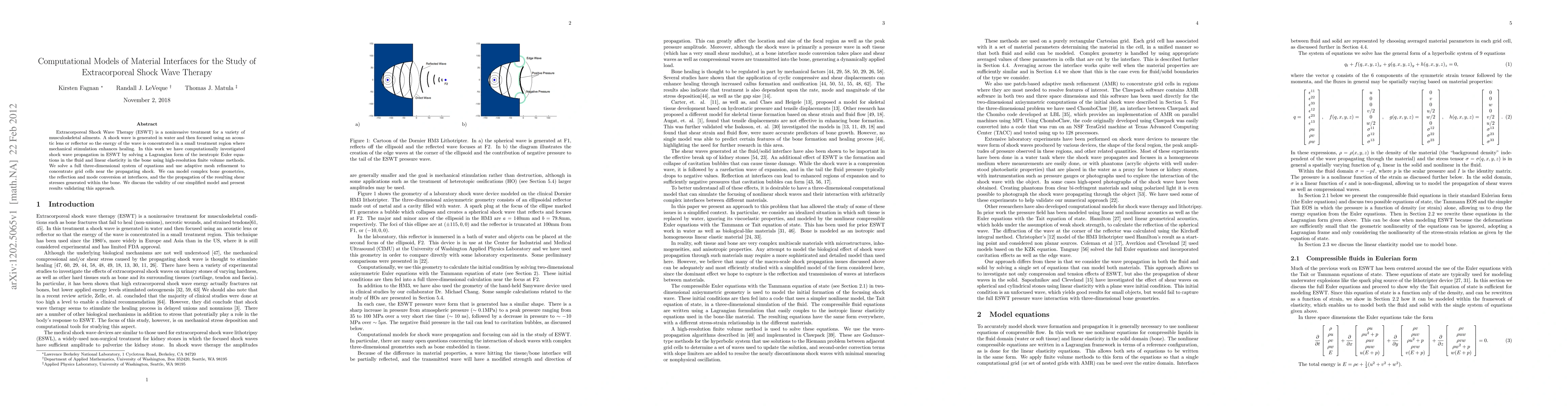 Extracorporeal Shock Wave Therapy (ESWT) is a noninvasive treatment for a variety of musculoskeletal ailments. A shock wave is generated in water and then focused using an acoustic lens or reflector so the energy of the wave is concentrated in a small treatment region where mechanical stimulation enhances healing. In this work we have computationally investigated shock wave propagation in ESWT by solving a Lagrangian form of the isentropic Euler equations in the fluid and linear elasticity in the bone using high-resolution finite volume methods. We solve a full three-dimensional system of equations and use adaptive mesh refinement to concentrate grid cells near the propagating shock. We can model complex bone geometries, the reflection and mode conversion at interfaces, and the the propagation of the resulting shear stresses generated within the bone. We discuss the validity of our simplified model and present results validating this approach.