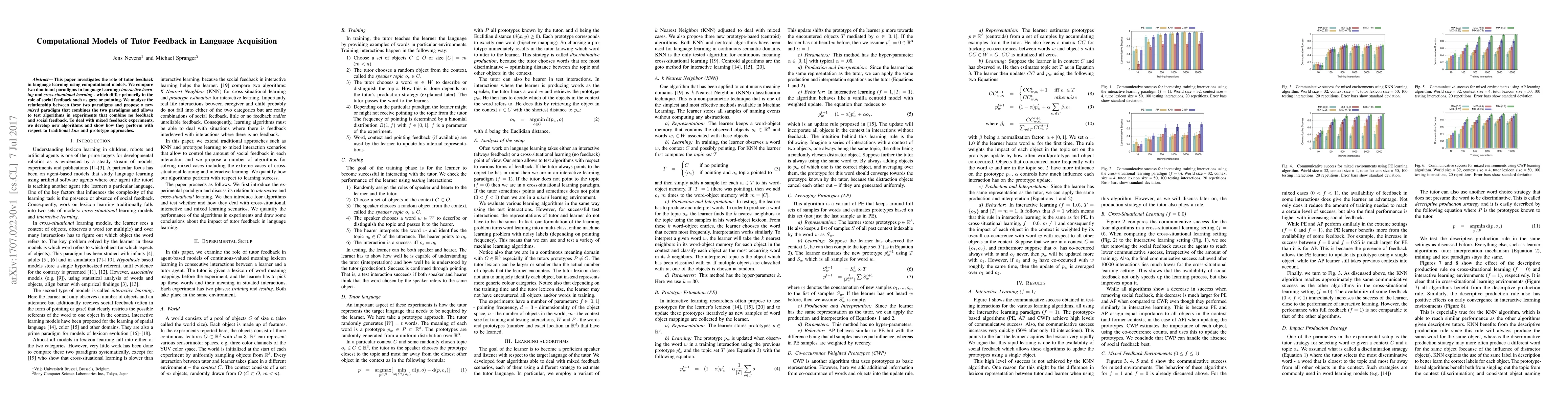 This paper explores computational models of tutor feedback in language acquisition, comparing interactive learning and cross-situational learning paradigms. It proposes a new mixed paradigm combining both and develops new algorithms to handle mixed feedback experiments, evaluating their performance against traditional methods.