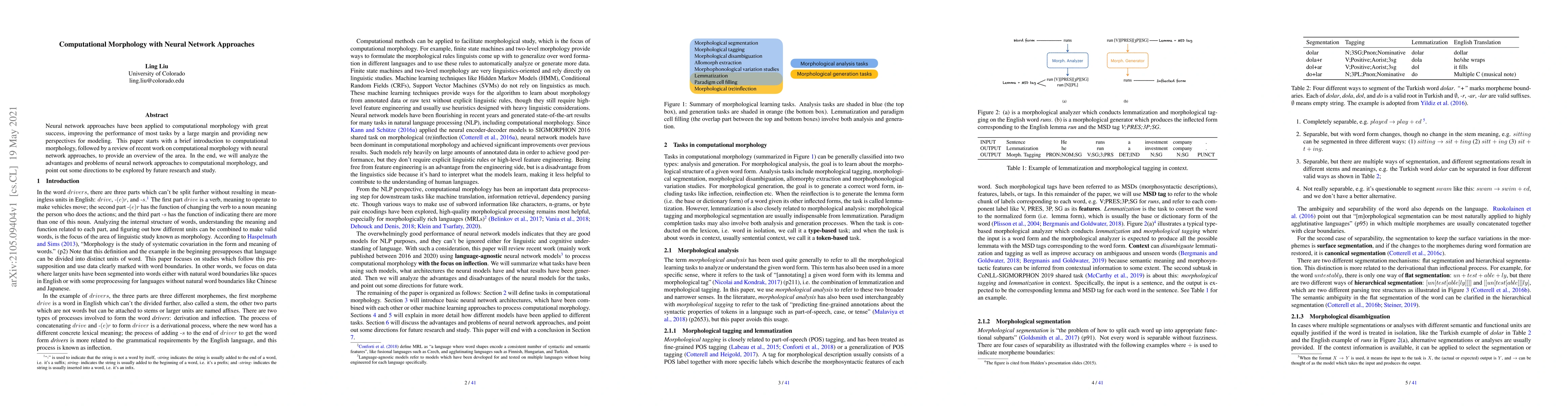 Neural network approaches have been applied to computational morphology with great success, improving the performance of most tasks by a large margin and providing new perspectives for modeling. This paper starts with a brief introduction to computational morphology, followed by a review of recent work on computational morphology with neural network approaches, to provide an overview of the area. In the end, we will analyze the advantages and problems of neural network approaches to computational morphology, and point out some directions to be explored by future research and study.