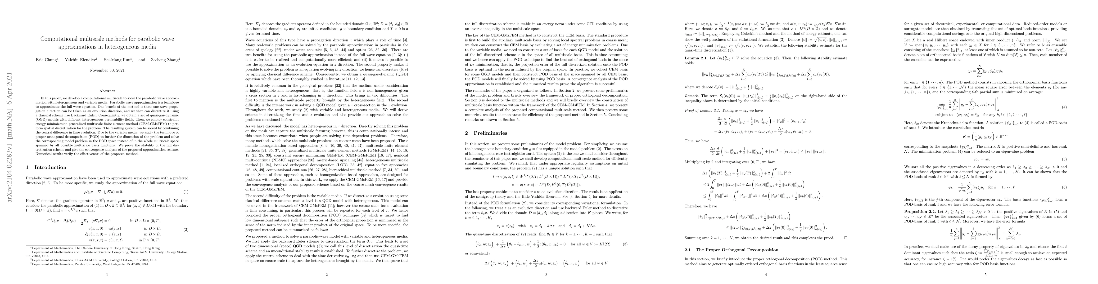 In this paper, we develop a computational multiscale to solve the parabolic wave approximation with heterogeneous and variable media. Parabolic wave approximation is a technique to approximate the full wave equation. One benefit of the method is that: one wave propagation direction can be taken as an evolution direction, and we then can discretize it using a classical scheme like Backward Euler. Consequently, we obtain a set of quasi-gas-dynamic (QGD) models with different heterogeneous permeability fields. Then, we employ constraint energy minimization generalized multiscale finite element method (CEM-GMsFEM) to perform spatial discretization for the problem. The resulting system can be solved by combining the central difference in time evolution. Due to the variable media, we apply the technique of proper orthogonal decomposition (POD) to further the dimension of the problem and solve the corresponding model problem in the POD space instead of in the whole multiscale space spanned by all possible multiscale basis functions. We prove the stability of the full discretization scheme and give the convergence analysis of the proposed approximation scheme. Numerical results verify the effectiveness of the proposed method.