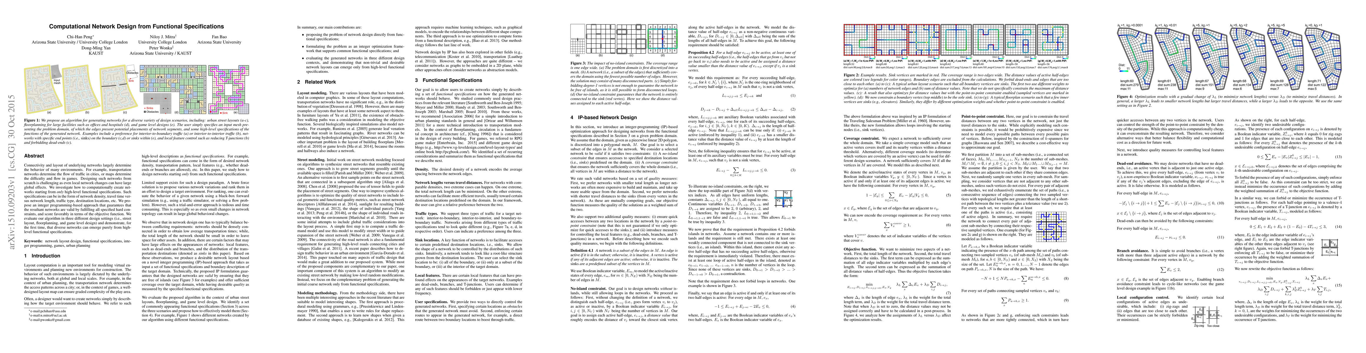 Connectivity and layout of underlying networks largely determine the behavior of many environments. For example, transportation networks determine the flow of traffic in cities, or maps determine the difficulty and flow in games. Designing such networks from scratch is challenging as even local network changes can have large global effects. We investigate how to computationally create networks starting from {\em only} high-level functional specifications. Such specifications can be in the form of network density, travel time versus network length, traffic type, destination locations, etc. We propose an integer programming-based approach that guarantees that the resultant networks are valid by fulfilling all specified hard constraints, and score favorably in terms of the objective function. We evaluate our algorithm in three different design settings (i.e., street layout, floorplanning, and game level design) and demonstrate, for the first time, that diverse networks can emerge purely from high-level functional specifications.