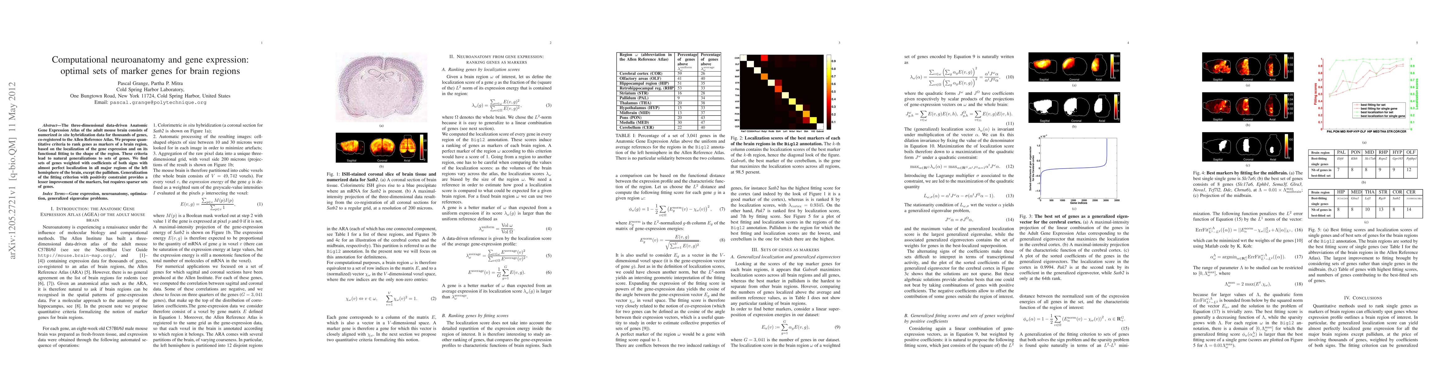 This paper proposes quantitative criteria to identify optimal sets of marker genes for brain regions using the Allen Gene Expression Atlas. It finds highly localized gene sets for most brain regions, except the pallidum, with some improvement from a positivity constraint, though requiring sparser gene sets.