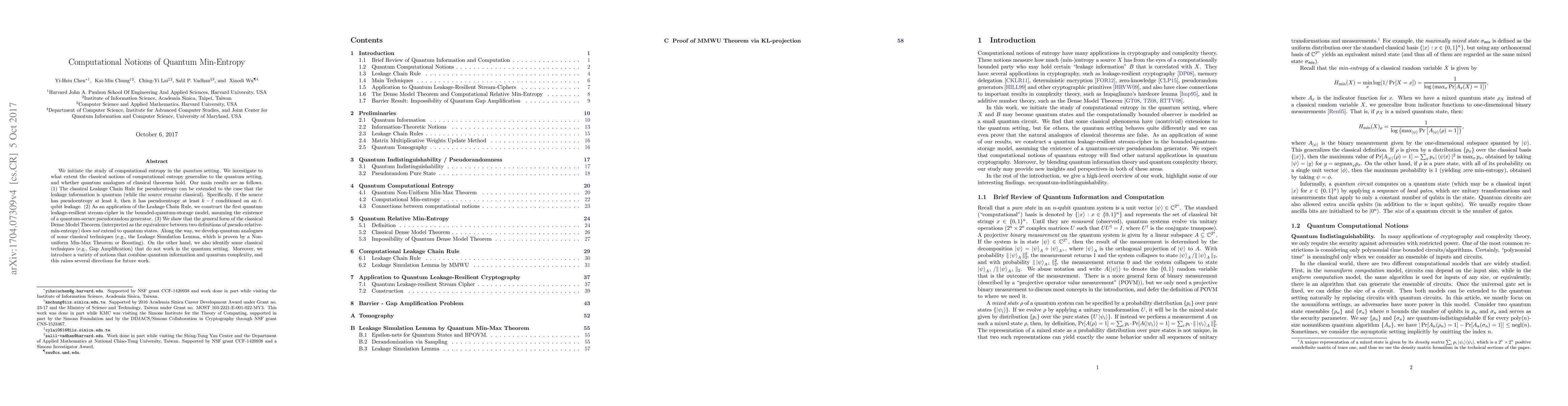 This paper explores computational entropy in the quantum setting, extending classical notions and theorems. It establishes a quantum Leakage Chain Rule and constructs a quantum leakage-resilient stream-cipher, while demonstrating that not all classical techniques translate to the quantum realm.
