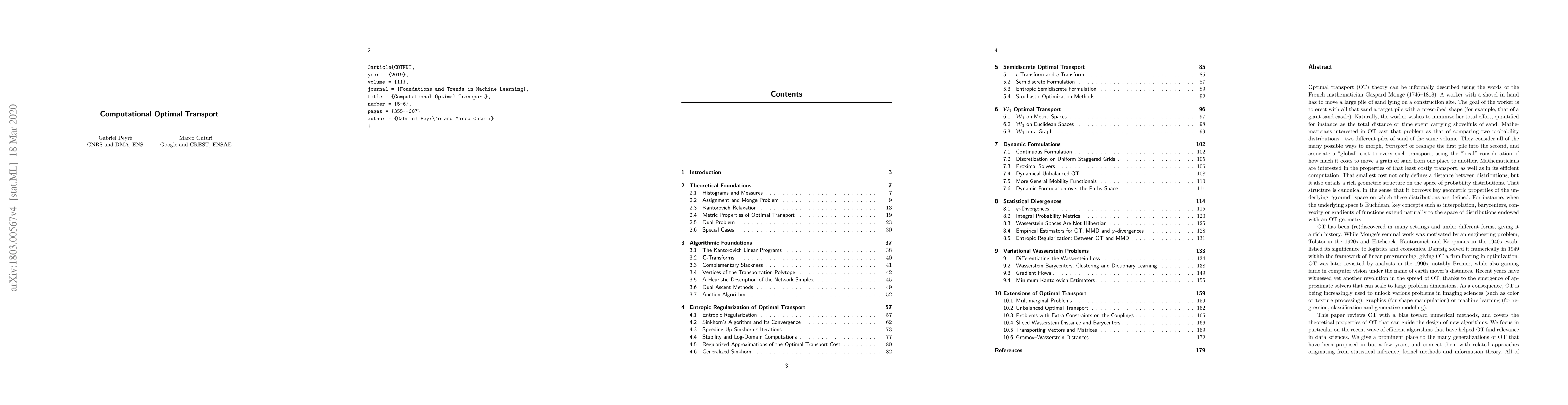 Optimal transport (OT) theory can be informally described using the words of the French mathematician Gaspard Monge (1746-1818): A worker with a shovel in hand has to move a large pile of sand lying on a construction site. The goal of the worker is to erect with all that sand a target pile with a prescribed shape (for example, that of a giant sand castle). Naturally, the worker wishes to minimize her total effort, quantified for instance as the total distance or time spent carrying shovelfuls of sand. Mathematicians interested in OT cast that problem as that of comparing two probability distributions, two different piles of sand of the same volume. They consider all of the many possible ways to morph, transport or reshape the first pile into the second, and associate a "global" cost to every such transport, using the "local" consideration of how much it costs to move a grain of sand from one place to another. Recent years have witnessed the spread of OT in several fields, thanks to the emergence of approximate solvers that can scale to sizes and dimensions that are relevant to data sciences. Thanks to this newfound scalability, OT is being increasingly used to unlock various problems in imaging sciences (such as color or texture processing), computer vision and graphics (for shape manipulation) or machine learning (for regression, classification and density fitting). This short book reviews OT with a bias toward numerical methods and their applications in data sciences, and sheds lights on the theoretical properties of OT that make it particularly useful for some of these applications.