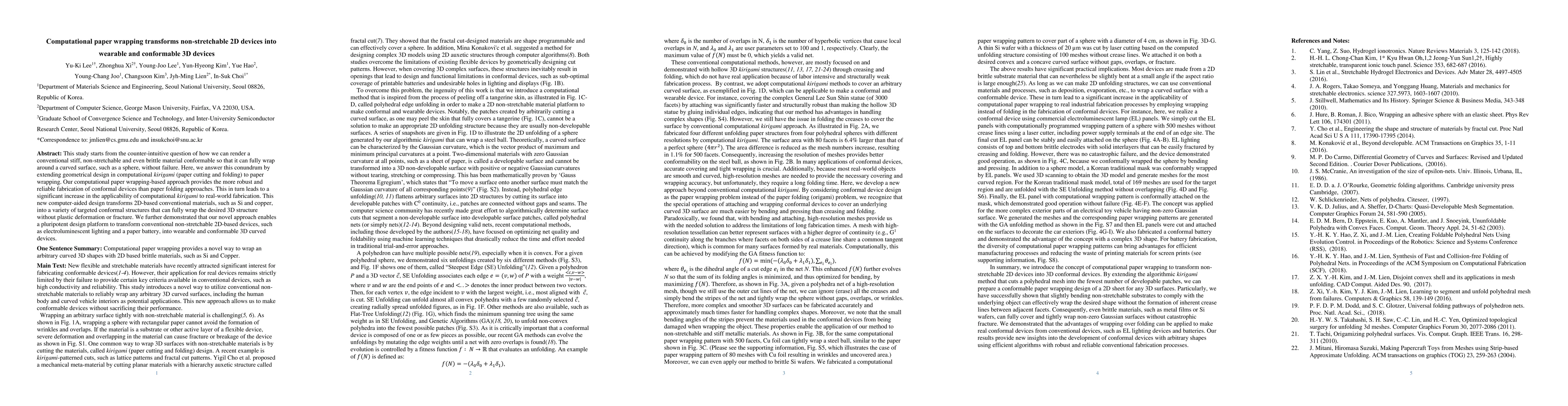 This study starts from the counter-intuitive question of how we can render a conventional stiff, non-stretchable and even brittle material conformable so that it can fully wrap around a curved surface, such as a sphere, without failure. Here, we answer this conundrum by extending geometrical design in computational kirigami (paper cutting and folding) to paper wrapping. Our computational paper wrapping-based approach provides the more robust and reliable fabrication of conformal devices than paper folding approaches. This in turn leads to a significant increase in the applicability of computational kirigami to real-world fabrication. This new computer-aided design transforms 2D-based conventional materials, such as Si and copper, into a variety of targeted conformal structures that can fully wrap the desired 3D structure without plastic deformation or fracture. We further demonstrated that our novel approach enables a pluripotent design platform to transform conventional non-stretchable 2D-based devices, such as electroluminescent lighting and a paper battery, into wearable and conformable 3D curved devices.