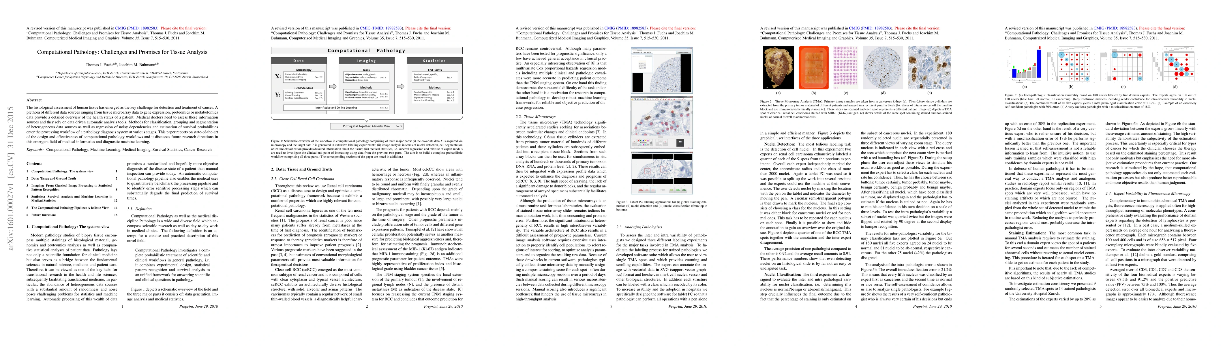 The histological assessment of human tissue has emerged as the key challenge for detection and treatment of cancer. A plethora of different data sources ranging from tissue microarray data to gene expression, proteomics or metabolomics data provide a detailed overview of the health status of a patient. Medical doctors need to assess these information sources and they rely on data driven automatic analysis tools. Methods for classification, grouping and segmentation of heterogeneous data sources as well as regression of noisy dependencies and estimation of survival probabilities enter the processing workflow of a pathology diagnosis system at various stages. This paper reports on state-of-the-art of the design and effectiveness of computational pathology workflows and it discusses future research directions in this emergent field of medical informatics and diagnostic machine learning.
