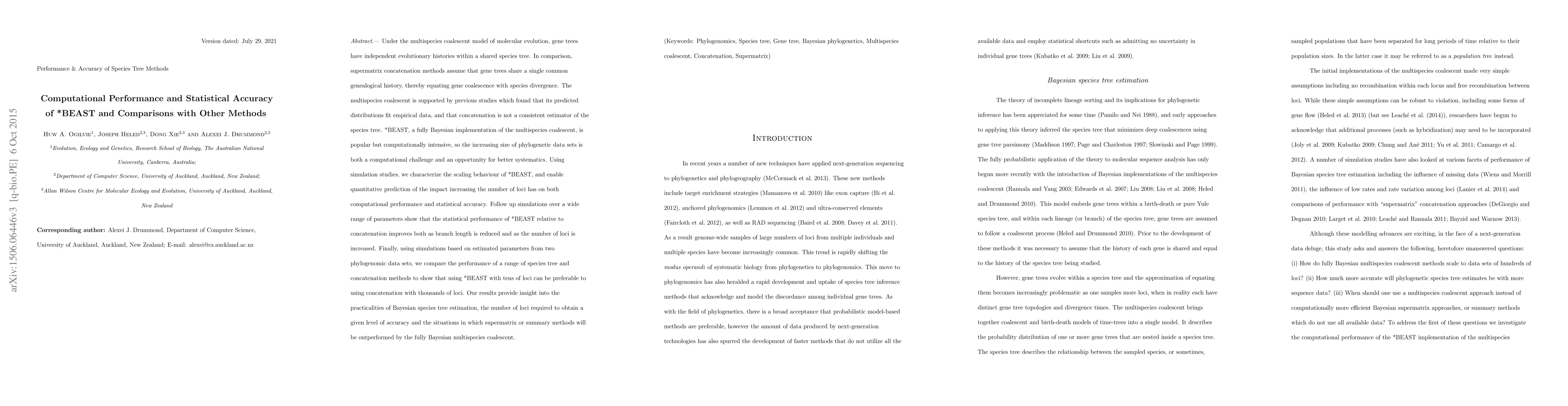 This paper evaluates the computational performance and statistical accuracy of *BEAST under the multispecies coalescent model, demonstrating its advantages over concatenation methods. Simulation studies show that *BEAST's accuracy improves with reduced branch lengths and increased loci, and it outperforms concatenation methods when using tens of loci.