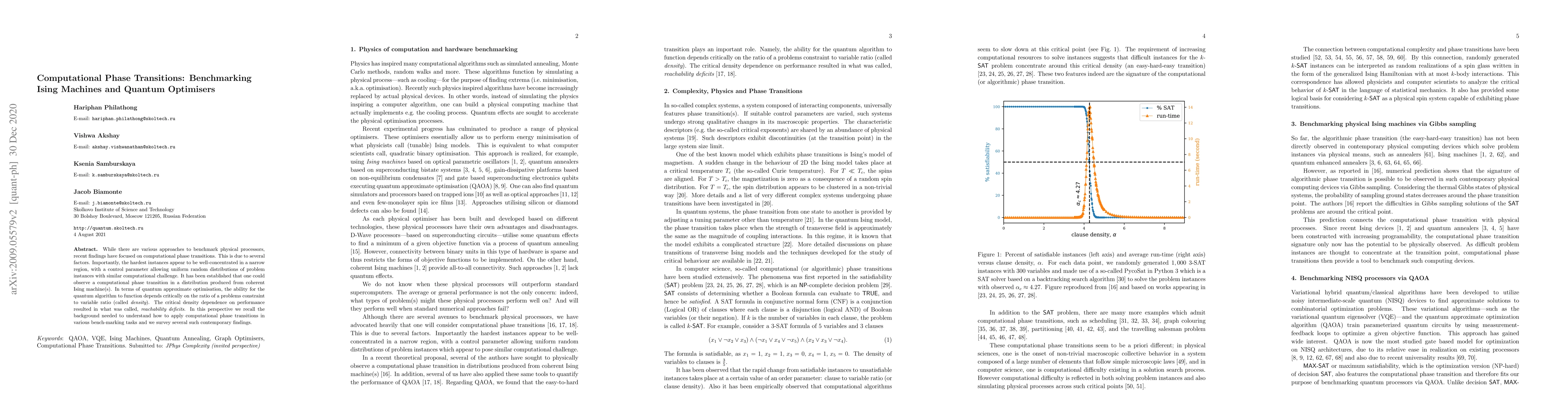 While there are various approaches to benchmark physical processors, recent findings have focused on computational phase transitions. This is due to several factors. Importantly, the hardest instances appear to be well-concentrated in a narrow region, with a control parameter allowing uniform random distributions of problem instances with similar computational challenge. It has been established that one could observe a computational phase transition in a distribution produced from coherent Ising machine(s). In terms of quantum approximate optimisation, the ability for the quantum algorithm to function depends critically on the ratio of a problems constraint to variable ratio (called density). The critical density dependence on performance resulted in what was called, reachability deficits. In this perspective we recall the background needed to understand how to apply computational phase transitions in various bench-marking tasks and we survey several such contemporary findings.