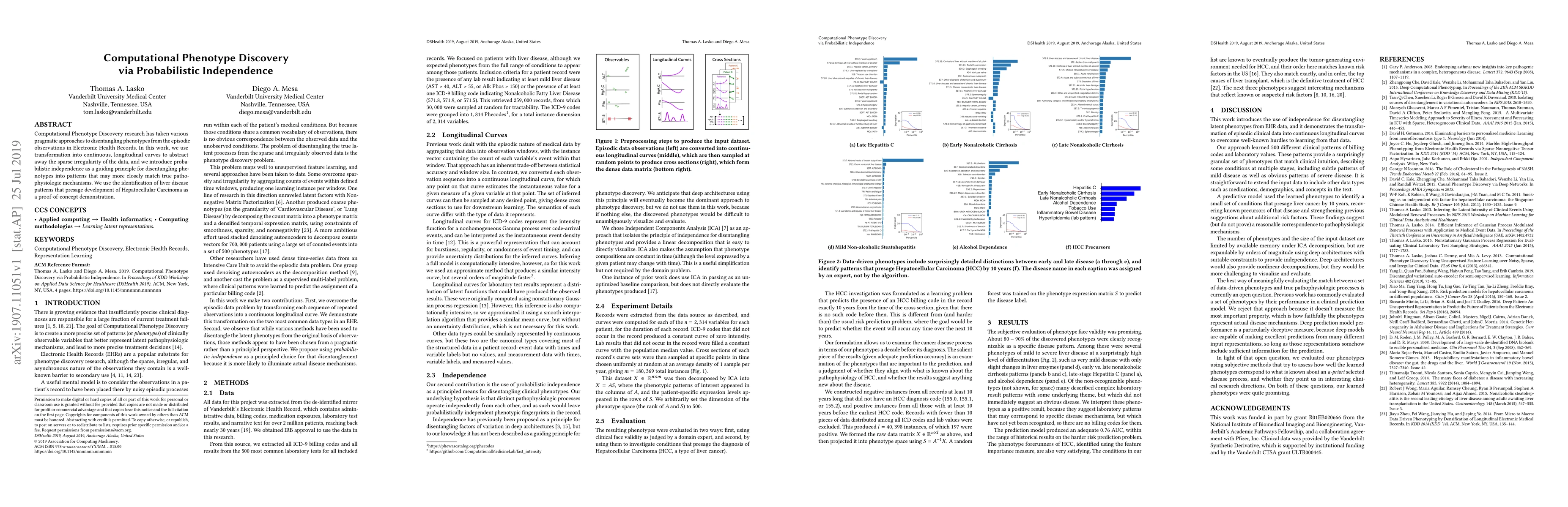 This paper proposes a method for computational phenotype discovery using probabilistic independence to identify patterns in Electronic Health Records, transforming episodic data into continuous curves. The approach is demonstrated through identifying liver disease patterns predicting Hepatocellular Carcinoma development.