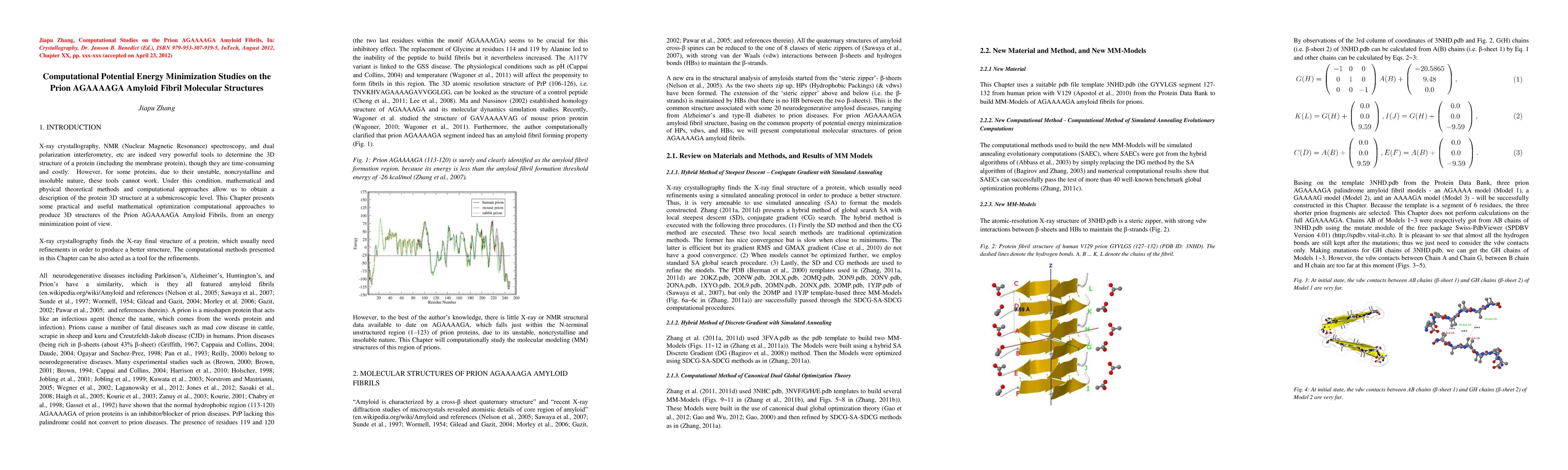 X-ray crystallography, NMR (Nuclear Magnetic Resonance) spectroscopy, and dual polarization interferometry, etc are indeed very powerful tools to determine the 3D structures of proteins (including the membrane proteins), though they are time-consuming and costly. However, for some proteins, due to their unstable, noncrystalline and insoluble nature, these tools cannot work. Under this condition, mathematical and physical theoretical methods and computational approaches allow us to obtain a description of the protein 3D structure at a submicroscopic level. This Chapter presents some practical and useful mathematical optimization computational approaches to produce 3D structures of the Prion AGAAAAGA Amyloid Fibrils, from a potential energy minimization point of view. X-ray crystallography finds the X-ray final structure of a protein, which usually need refinements in order to produce a better structure. The computational methods presented in this Chapter can be also acted as a tool for the refinements.