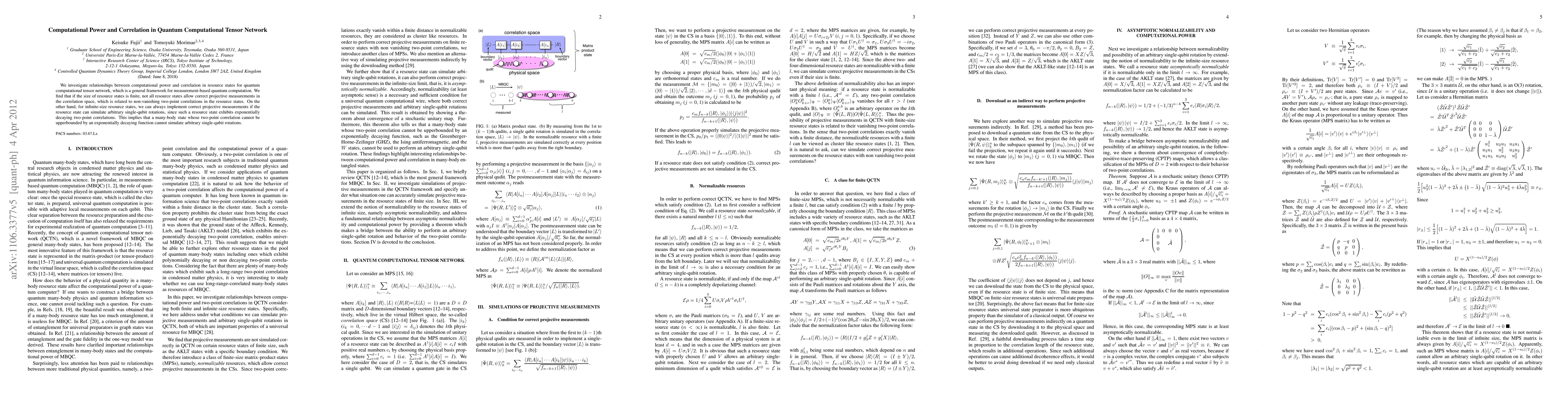 We investigate relations between computational power and correlation in resource states for quantum computational tensor network, which is a general framework for measurement-based quantum computation. We find that if the size of resource states is finite, not all resource states allow correct projective measurements in the correlation space, which is related to non-vanishing two-point correlations in the resource states. On the other hand, for infinite-size resource states, we can always implement correct projective measurements if the resource state can simulate arbitrary single-qubit rotations, since such a resource state exhibits exponentially-decaying two-point correlations. This implies that a many-body state whose two-point correlation cannot be upperbounded by an exponentially-decaying function cannot simulate arbitrary single-qubit rotations.