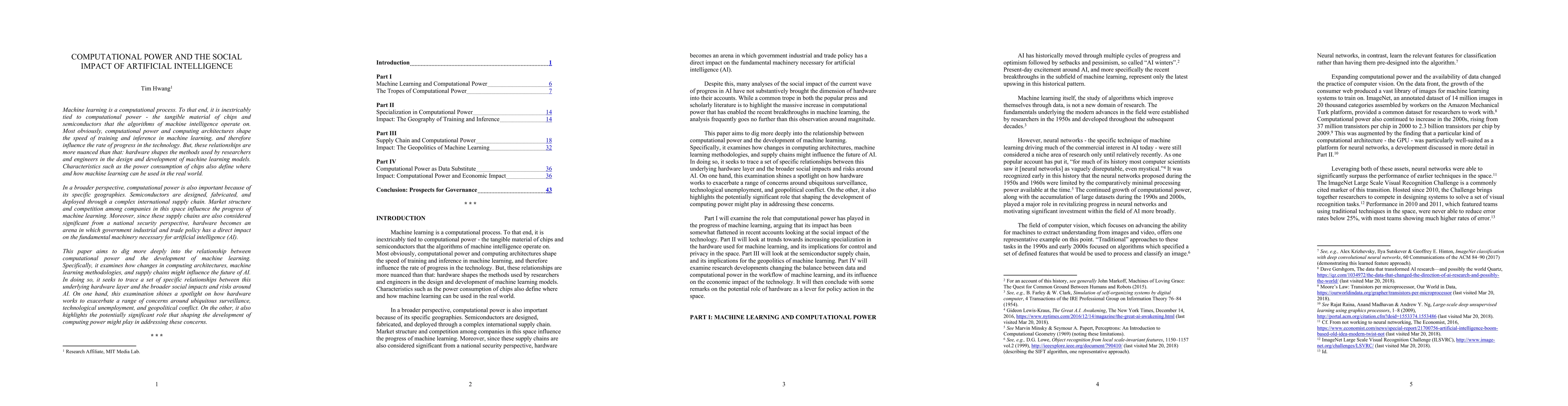 Machine learning is a computational process. To that end, it is inextricably tied to computational power - the tangible material of chips and semiconductors that the algorithms of machine intelligence operate on. Most obviously, computational power and computing architectures shape the speed of training and inference in machine learning, and therefore influence the rate of progress in the technology. But, these relationships are more nuanced than that: hardware shapes the methods used by researchers and engineers in the design and development of machine learning models. Characteristics such as the power consumption of chips also define where and how machine learning can be used in the real world. Despite this, many analyses of the social impact of the current wave of progress in AI have not substantively brought the dimension of hardware into their accounts. While a common trope in both the popular press and scholarly literature is to highlight the massive increase in computational power that has enabled the recent breakthroughs in machine learning, the analysis frequently goes no further than this observation around magnitude. This paper aims to dig more deeply into the relationship between computational power and the development of machine learning. Specifically, it examines how changes in computing architectures, machine learning methodologies, and supply chains might influence the future of AI. In doing so, it seeks to trace a set of specific relationships between this underlying hardware layer and the broader social impacts and risks around AI.