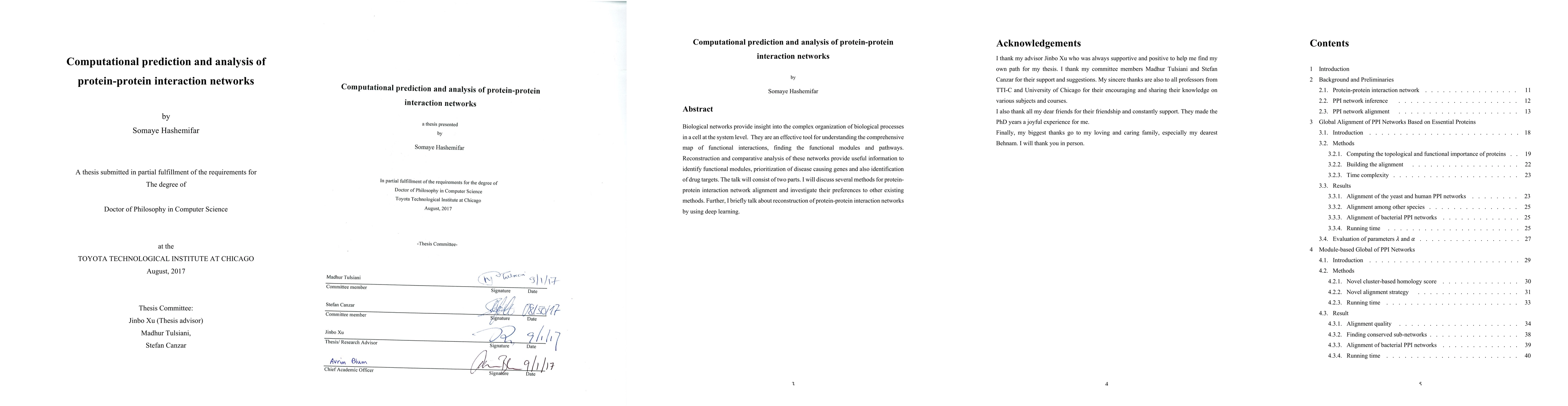This paper explores computational methods for predicting and analyzing protein-protein interaction networks, focusing on network alignment and deep learning reconstruction techniques to identify functional modules and prioritize disease-causing genes and drug targets.