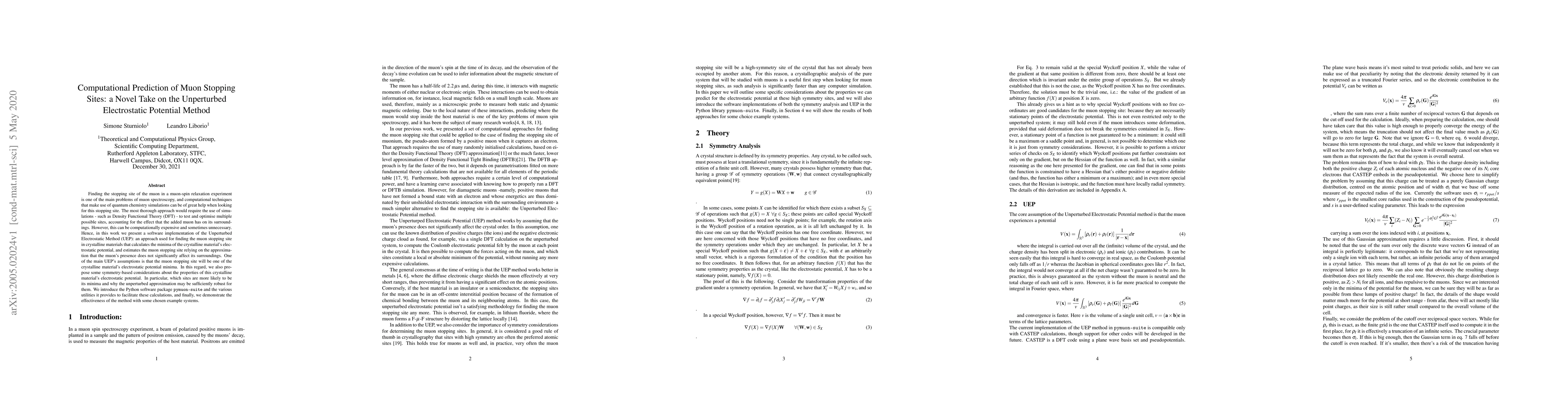 This paper introduces a computational method using the Unperturbed Electrostatic Potential (UEP) to predict muon stopping sites in crystalline materials, proposing that these sites are likely to be electrostatic potential minima. The authors present the pymuon-suite software package to implement this method and demonstrate its effectiveness through computational examples.