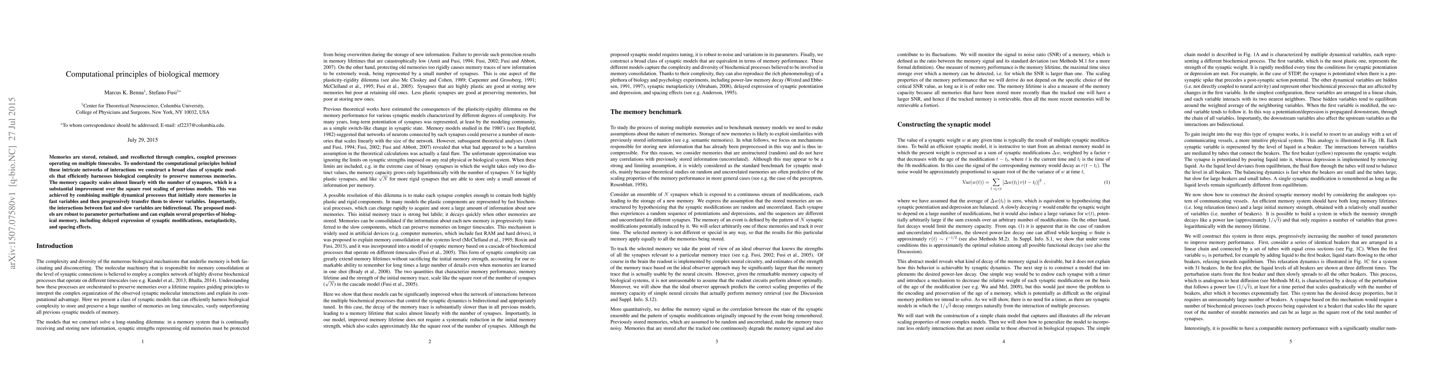 Memories are stored, retained, and recollected through complex, coupled processes operating on multiple timescales. To understand the computational principles behind these intricate networks of interactions we construct a broad class of synaptic models that efficiently harnesses biological complexity to preserve numerous memories. The memory capacity scales almost linearly with the number of synapses, which is a substantial improvement over the square root scaling of previous models. This was achieved by combining multiple dynamical processes that initially store memories in fast variables and then progressively transfer them to slower variables. Importantly, the interactions between fast and slow variables are bidirectional. The proposed models are robust to parameter perturbations and can explain several properties of biological memory, including delayed expression of synaptic modifications, metaplasticity, and spacing effects.