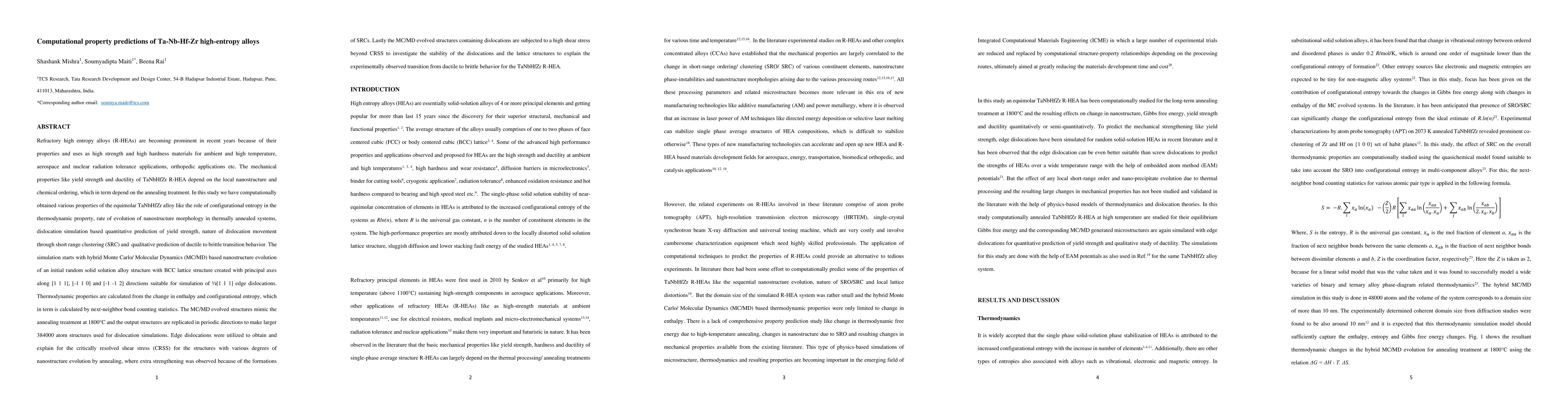 Refractory high entropy alloys (R-HEAs) are having properties and uses as high strength and high hardness materials for ambient and high temperature, aerospace and nuclear radiation tolerance applications, orthopedic applications etc. The mechanical properties like yield strength and ductility of TaNbHfZr R-HEA depend on the local nanostructure and chemical ordering. In this study we have computationally obtained various properties of the TaNbHfZr alloy like the role of configurational entropy in the thermodynamic property, rate of evolution of nanostructure morphology in thermally annealed systems, dislocation simulation based quantitative prediction of yield strength, nature of dislocation movement through short range clustering (SRC) and qualitative prediction of ductile to brittle transition behavior. The simulation starts with hybrid Monte Carlo/ Molecular Dynamics (MC/MD) based nanostructure evolution of an initial random solid solution alloy structure with BCC lattice structure created with principal axes along [1 1 1], [-1 1 0] and [-1 -1 2] directions suitable for simulation of 1/2[1 1 1] edge dislocations. Thermodynamic properties are calculated from the change in enthalpy and the configurational entropy by next-neighbor bond counting statistics. The MC/MD evolved structures mimic the annealing treatment at 1800{\deg}C and the output structures are replicated in periodic directions to make larger 384000 atom structures used for dislocation simulations. Edge dislocations were utilized to obtain and explain for the extra strengthening observed because of the formations of SRCs. Lastly the MC/MD evolved structures containing dislocations are subjected to a high shear stress beyond CRSS to investigate the stability of the dislocations and the lattice structures to explain the experimentally observed transition from ductile to brittle behavior for the TaNbHfZr R-HEA.