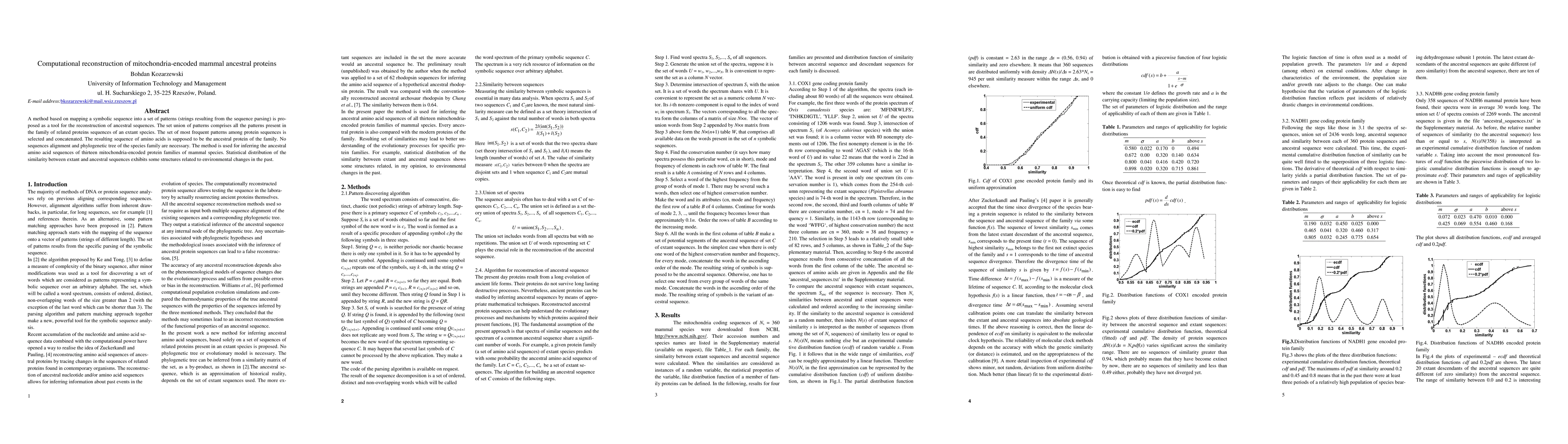 A method based on mapping a symbolic sequence into a set of patterns (strings resulting from the sequence parsing) is proposed as a tool for the reconstruction of ancestral sequences. The set union of patterns comprises all the patterns present in the family of related proteins sequences of an extant species. The set of most frequent patterns among protein sequences is selected and concatenated. The resulting sequence of amino acids is supposed to be the ancestral protein of the family. No sequences alignment and phylogenetic tree of the species family are necessary. The method is used for inferring the ancestral amino acid sequences of thirteen mitochondria-encoded protein families of mammal species. Statistical distribution of the similarity between extant and ancestral sequences exhibits some structures related to environmental changes in the past.