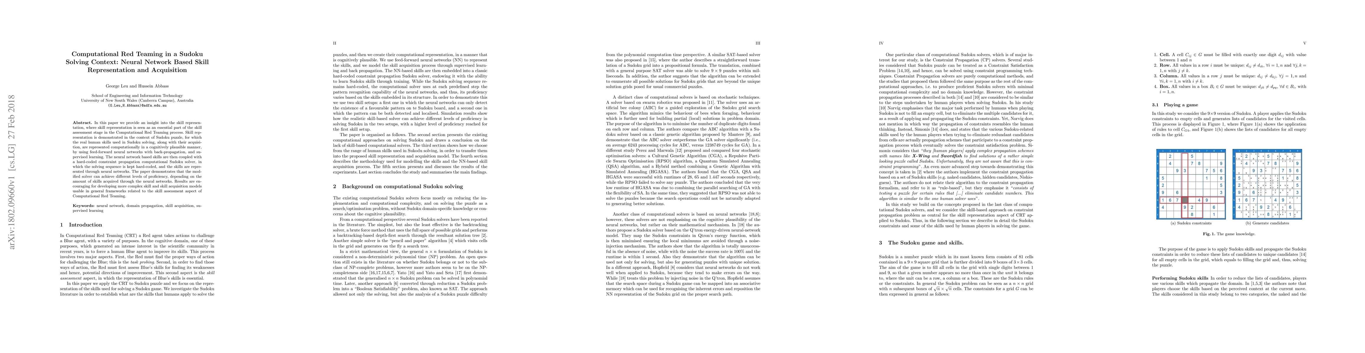 This paper explores skill representation and acquisition in a computational red teaming context using neural networks to model human Sudoku solving skills. The neural network-based skills are integrated with a hard-coded Sudoku solver, demonstrating the solver's proficiency varies with skill acquisition, showing potential for broader skill assessment frameworks.