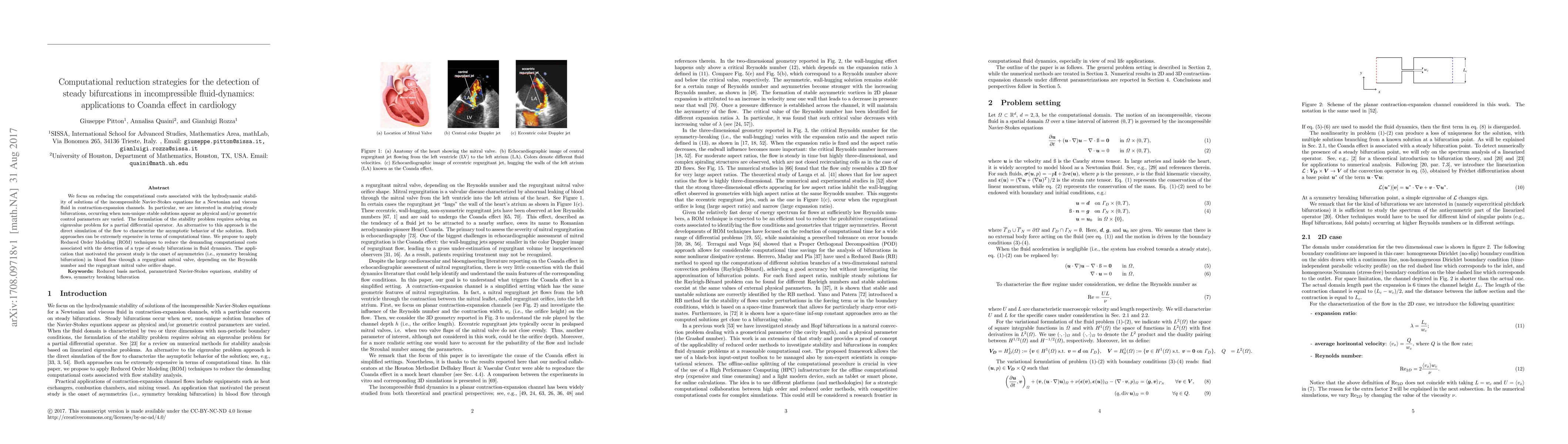 This paper proposes Reduced Order Modeling (ROM) techniques to reduce computational costs for detecting steady bifurcations in incompressible fluid dynamics, specifically focusing on the Coanda effect in cardiology applications, such as blood flow asymmetries through a mitral valve. The study aims to efficiently analyze the stability of fluid solutions under varying parameters.