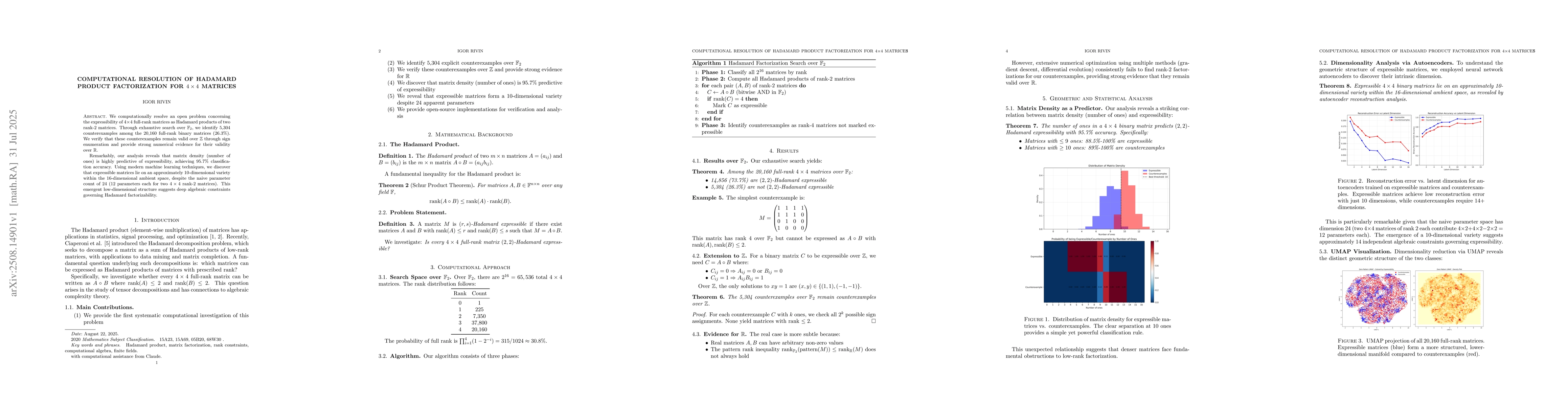 We computationally resolve an open problem concerning the expressibility of $4 \times 4$ full-rank matrices as Hadamard products of two rank-2 matrices. Through exhaustive search over $\mathbb{F}_2$, we identify 5,304 counterexamples among the 20,160 full-rank binary matrices (26.3\%). We verify that these counterexamples remain valid over $\mathbb{Z}$ through sign enumeration and provide strong numerical evidence for their validity over $\mathbb{R}$. Remarkably, our analysis reveals that matrix density (number of ones) is highly predictive of expressibility, achieving 95.7\% classification accuracy. Using modern machine learning techniques, we discover that expressible matrices lie on an approximately 10-dimensional variety within the 16-dimensional ambient space, despite the naive parameter count of 24 (12 parameters each for two $4 \times 4$ rank-2 matrices). This emergent low-dimensional structure suggests deep algebraic constraints governing Hadamard factorizability.