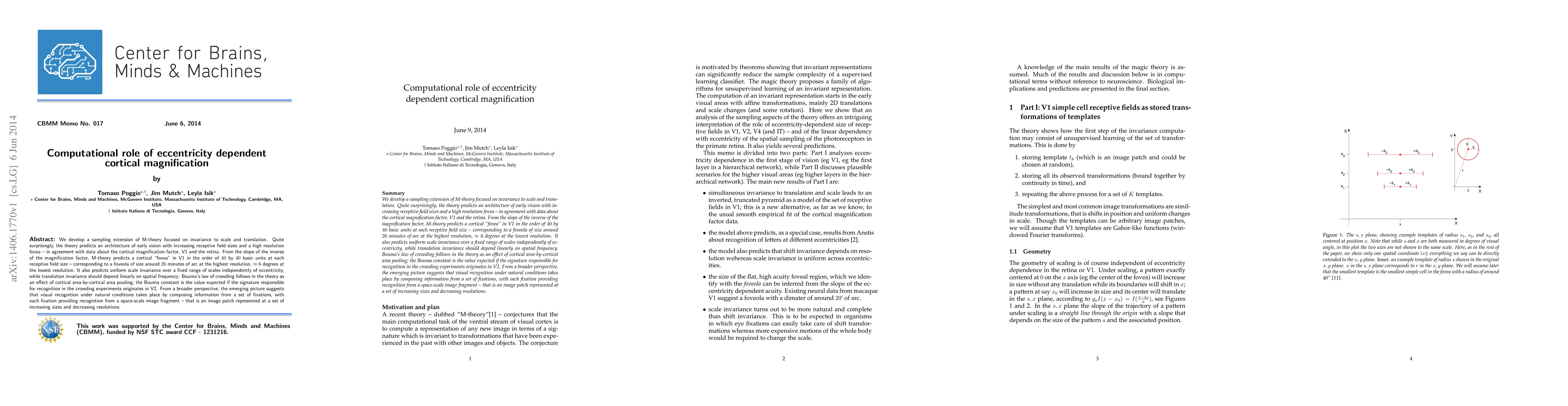 The paper proposes an M-theory extension that predicts a cortical magnification architecture consistent with visual data, revealing a high-resolution fovea and a foveola size of approximately 26 minutes of arc. It also suggests scale invariance and translation invariance dependent on spatial frequency, explaining Bouma's law of crowding through cortical area pooling.