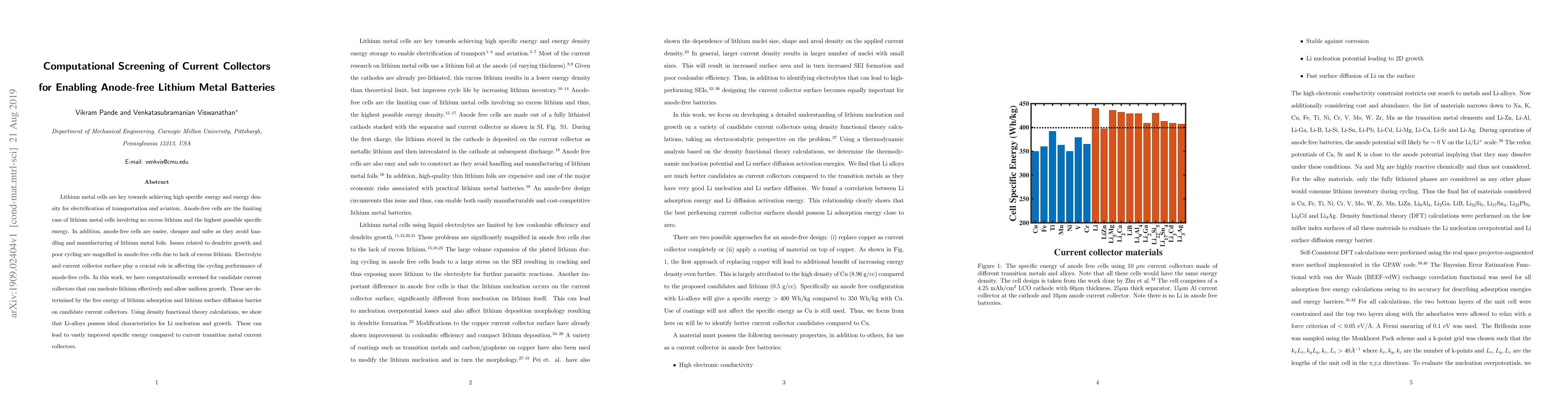 This paper computationally screens potential current collectors for anode-free lithium metal batteries, focusing on materials that promote effective lithium nucleation and uniform growth. Density functional theory calculations reveal that lithium alloys are optimal for these purposes, potentially leading to significant improvements in specific energy.