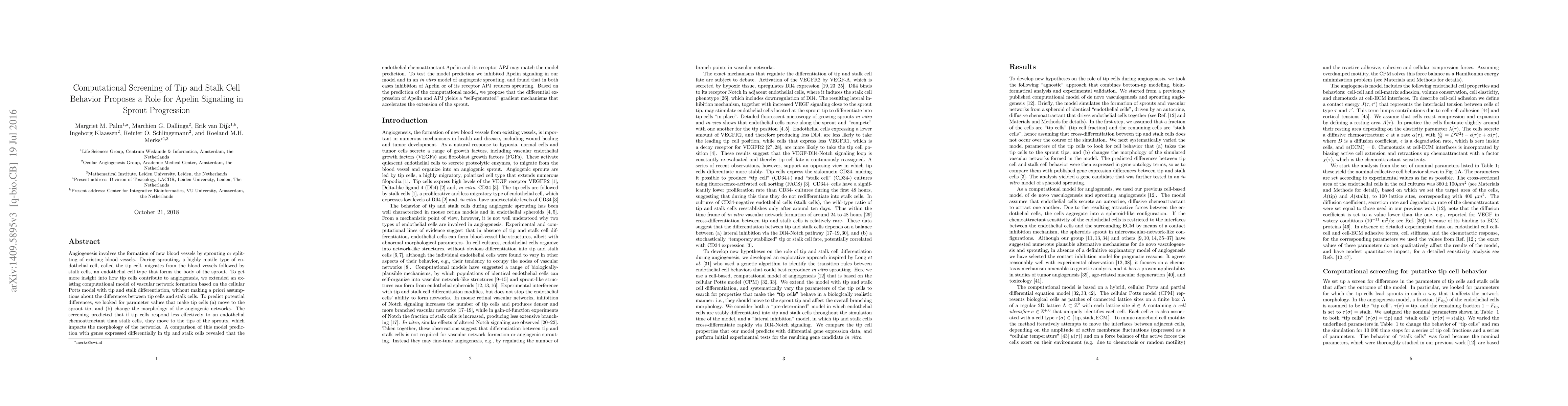 This paper uses computational modeling to investigate the roles of tip and stalk cells in angiogenesis. The study proposes that Apelin signaling, which is differentially expressed in tip and stalk cells, plays a crucial role in sprout progression, as inhibition of Apelin signaling reduces sprouting in both computational and \emph{in vitro} models.