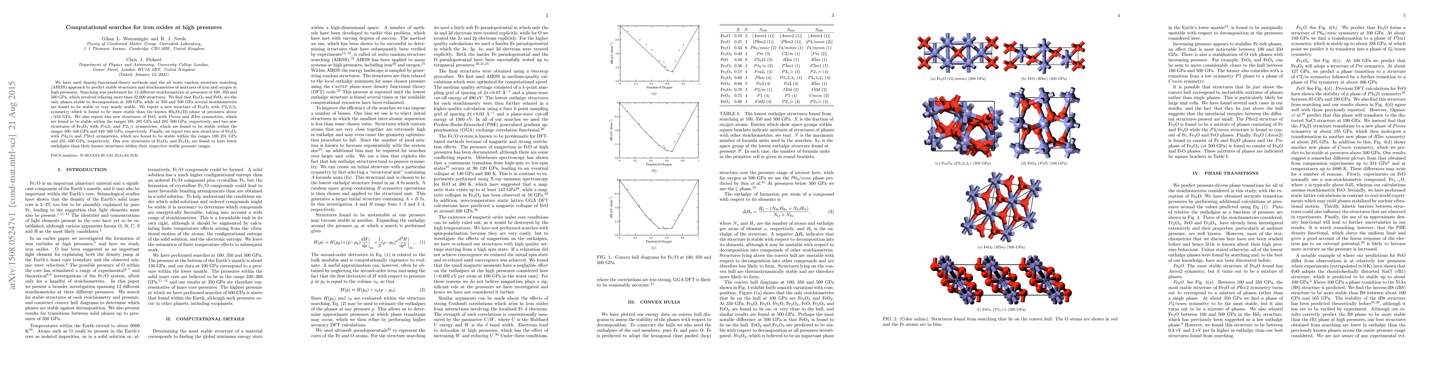 This study employs density-functional-theory and ab initio methods to predict stable iron oxide structures at high pressures, identifying new stable phases of Fe$_2$O$_3$, FeO, Fe$_3$O$_4$, and Fe$_4$O$_5$ with varying stabilities across different pressure ranges.