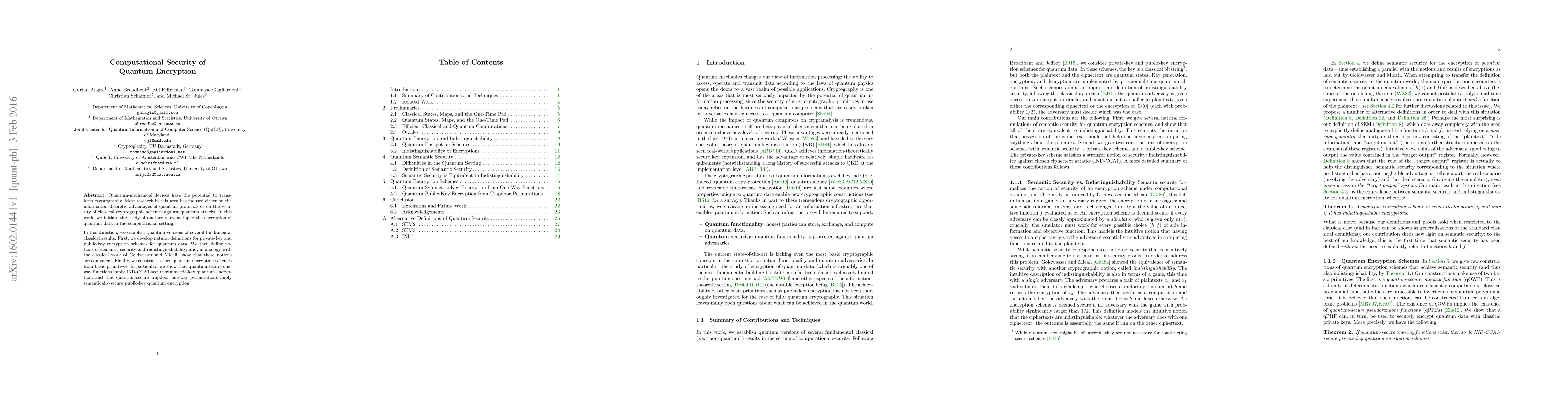 This paper explores the computational security of quantum encryption, establishing definitions for quantum private-key and public-key encryption schemes. It demonstrates equivalence between semantic security and indistinguishability for quantum data, and constructs secure quantum encryption schemes based on quantum-secure primitives.