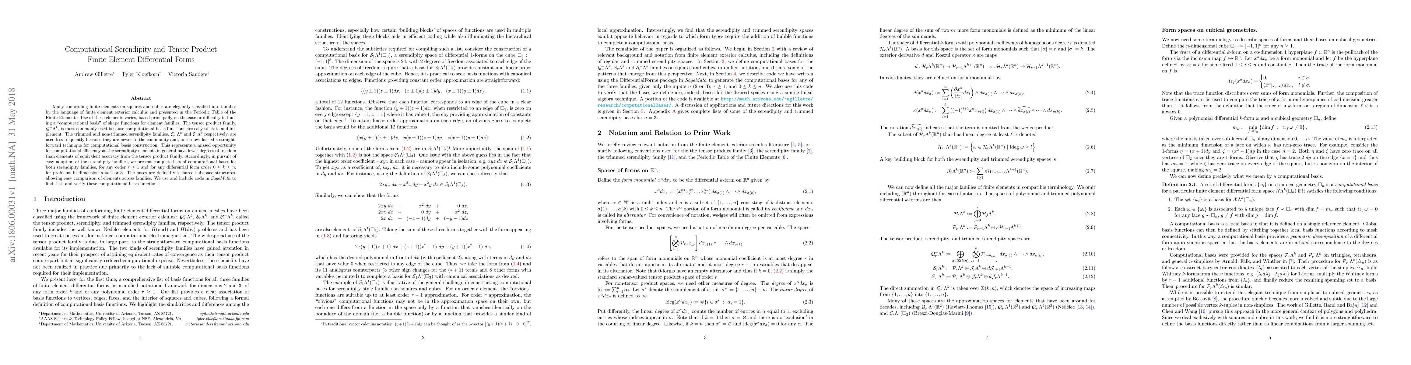 Many conforming finite elements on squares and cubes are elegantly classified into families by the language of finite element exterior calculus and presented in the Periodic Table of the Finite Elements. Use of these elements varies, based principally on the ease or difficulty in finding a "computational basis" of shape functions for element families. The tensor product family, $Q^-_r\Lambda^k$, is most commonly used because computational basis functions are easy to state and implement. The trimmed and non-trimmed serendipity families, $S^-_r\Lambda^k$ and $S_r\Lambda^k$ respectively, are used less frequently because they are newer to the community and, until now, lacked a straightforward technique for computational basis construction. This represents a missed opportunity for computational efficiency as the serendipity elements in general have fewer degrees of freedom than elements of equivalent accuracy from the tensor product family. Accordingly, in pursuit of easy adoption of the serendipity families, we present complete lists of computational bases for both serendipity families, for any order $r\geq 1$ and for any differential form order $0\leq k\leq n$, for problems in dimension $n=2$ or $3$. The bases are defined via shared subspace structures, allowing easy comparison of elements across families. We use and include code in SageMath to find, list, and verify these computational basis functions.