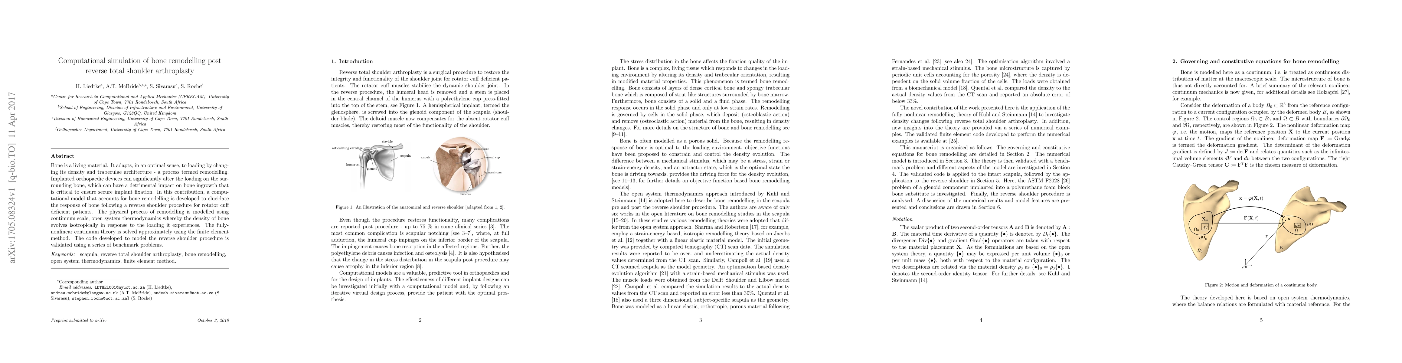 Bone is a living material. It adapts, in an optimal sense, to loading by changing its density and trabeculae architecture - a process termed remodelling. Implanted orthopaedic devices can significantly alter the loading on the surrounding bone, which can have a detrimental impact on bone ingrowth that is critical to ensure secure implant fixation. In this contribution, a computational model that accounts for bone remodelling is developed to elucidate the response of bone following a reverse shoulder procedure for rotator cuff deficient patients. The physical process of remodelling is modelled using continuum scale, open system thermodynamics whereby the density of bone evolves isotropically in response to the loading it experiences. The fully-nonlinear continuum theory is solved approximately using the finite element method. The code developed to model the reverse shoulder procedure is validated using a series of benchmark problems.