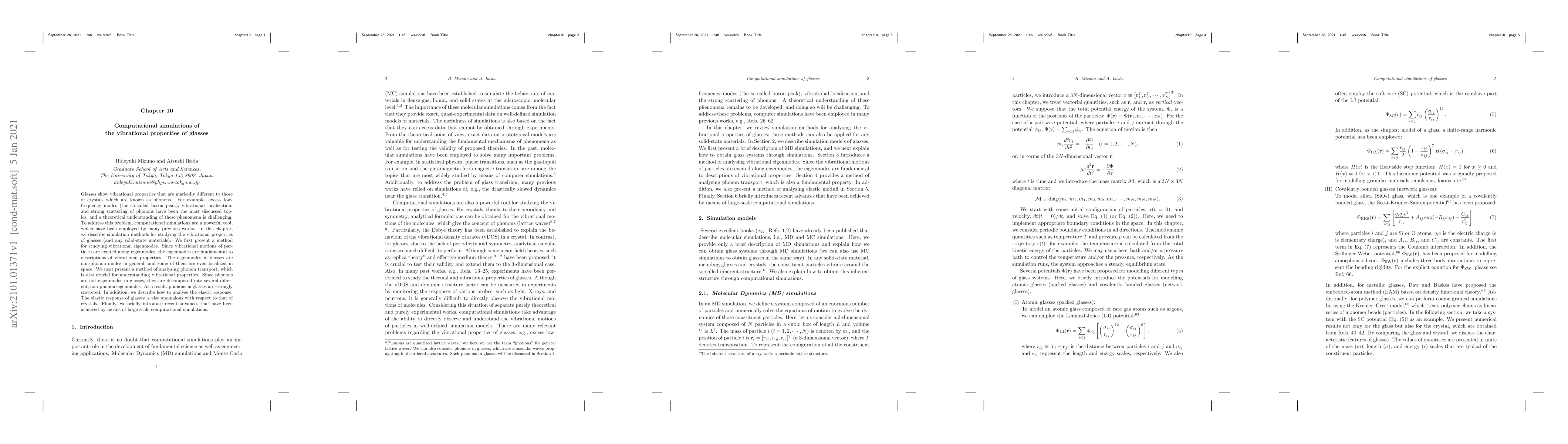 Glasses show vibrational properties that are markedly different to those of crystals which are known as phonons. For example, excess low-frequency modes (the so-called boson peak), vibrational localization, and strong scattering of phonons have been the most discussed topics, and a theoretical understanding of these phenomena is challenging. To address this problem, computational simulations are a powerful tool, which have been employed by many previous works. In this chapter, we describe simulation methods for studying the vibrational properties of glasses (and any solid-state materials). We first present a method for studying vibrational eigenmodes. Since vibrational motions of particles are excited along eigenmodes, the eigenmodes are fundamental to descriptions of vibrational properties. The eigenmodes in glasses are non-phonon modes in general, and some of them are even localized in space. We next present a method of analysing phonon transport, which is also crucial for understanding vibrational properties. Since phonons are not eigenmodes in glasses, they are decomposed into several different, non-phonon eigenmodes. As a result, phonons in glasses are strongly scattered. In addition, we describe how to analyse the elastic response. The elastic response of glasses is also anomalous with respect to that of crystals. Finally, we briefly introduce recent advances that have been achieved by means of large-scale computational simulations.