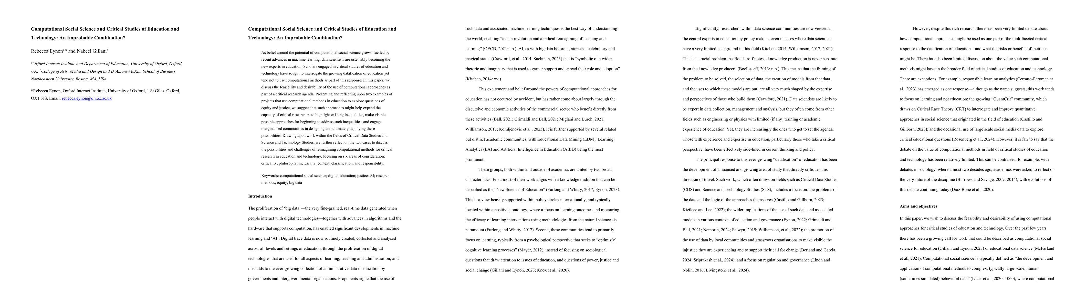As belief around the potential of computational social science grows, fuelled by recent advances in machine learning, data scientists are ostensibly becoming the new experts in education. Scholars engaged in critical studies of education and technology have sought to interrogate the growing datafication of education yet tend not to use computational methods as part of this response. In this paper, we discuss the feasibility and desirability of the use of computational approaches as part of a critical research agenda. Presenting and reflecting upon two examples of projects that use computational methods in education to explore questions of equity and justice, we suggest that such approaches might help expand the capacity of critical researchers to highlight existing inequalities, make visible possible approaches for beginning to address such inequalities, and engage marginalised communities in designing and ultimately deploying these possibilities. Drawing upon work within the fields of Critical Data Studies and Science and Technology Studies, we further reflect on the two cases to discuss the possibilities and challenges of reimagining computational methods for critical research in education and technology, focusing on six areas of consideration: criticality, philosophy, inclusivity, context, classification, and responsibility.