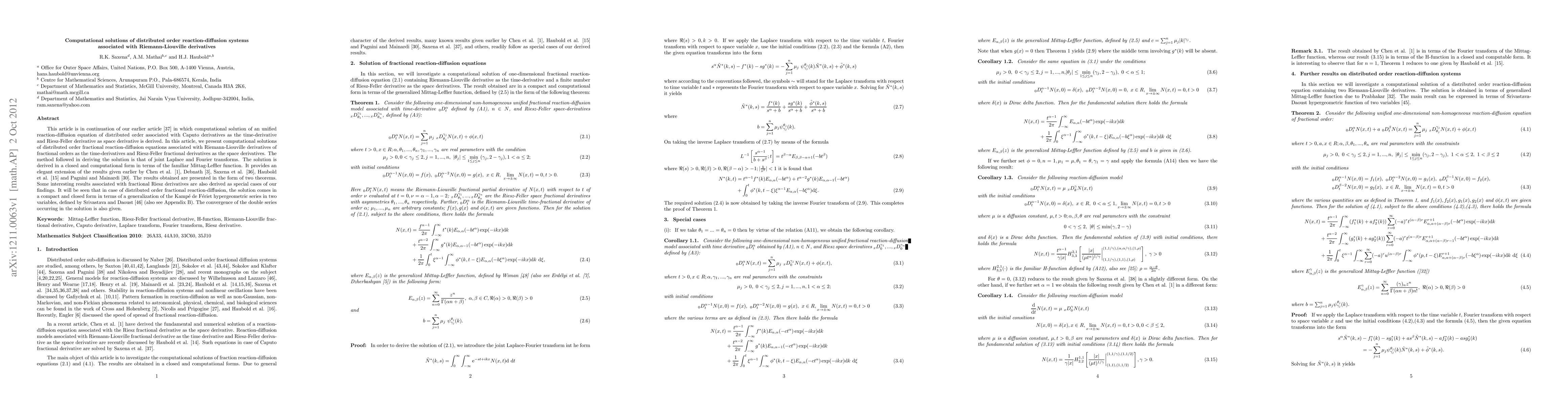 This paper extends computational solutions for distributed order fractional reaction-diffusion systems using Riemann-Liouville derivatives for time and Riesz-Feller derivatives for space. The method employs joint Laplace and Fourier transforms, yielding closed-form solutions in terms of the Mittag-Leffler function and a generalized hypergeometric series.