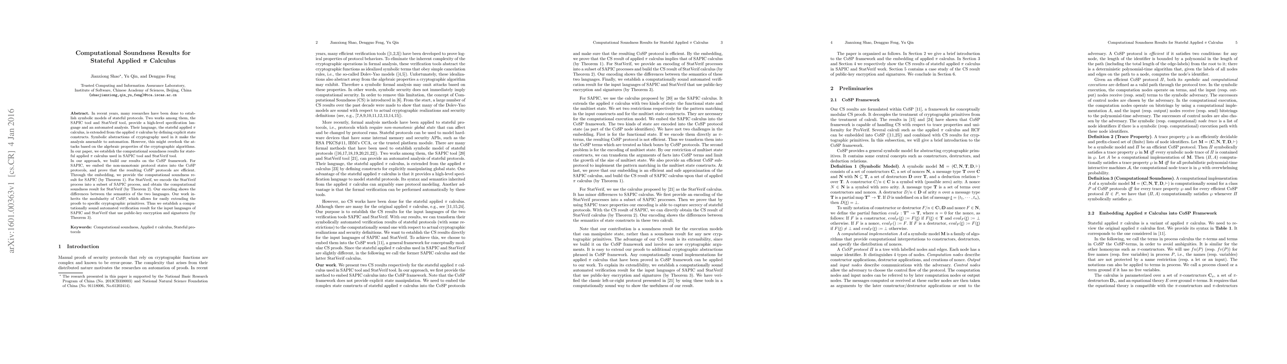 This paper establishes computational soundness results for the stateful applied pi calculus used in the SAPIC and StatVerif tools, which automate the analysis of stateful protocols. The authors leverage the CoSP framework to embed and encode these protocols, proving soundness through theorems that highlight differences in semantics and the modularity of CoSP for extending to specific cryptographic primitives.