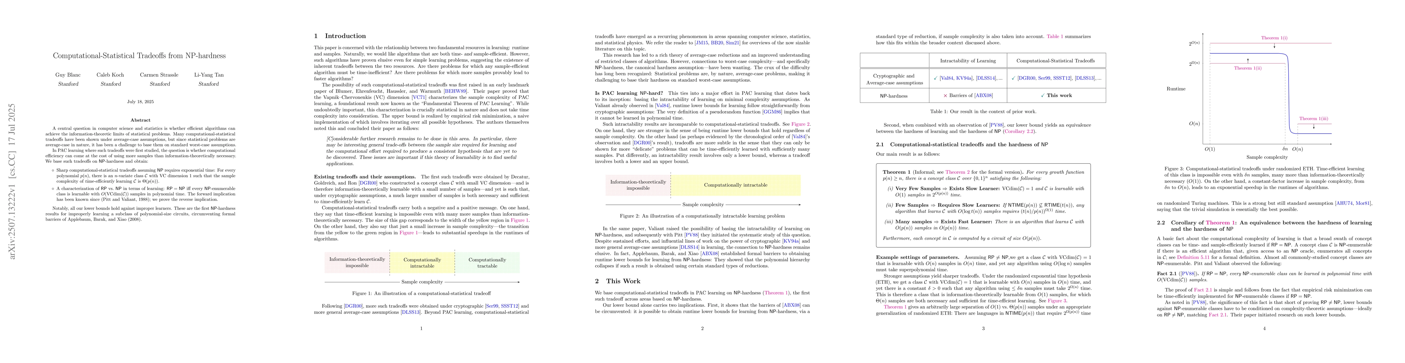 A central question in computer science and statistics is whether efficient algorithms can achieve the information-theoretic limits of statistical problems. Many computational-statistical tradeoffs have been shown under average-case assumptions, but since statistical problems are average-case in nature, it has been a challenge to base them on standard worst-case assumptions. In PAC learning where such tradeoffs were first studied, the question is whether computational efficiency can come at the cost of using more samples than information-theoretically necessary. We base such tradeoffs on $\mathsf{NP}$-hardness and obtain: $\circ$ Sharp computational-statistical tradeoffs assuming $\mathsf{NP}$ requires exponential time: For every polynomial $p(n)$, there is an $n$-variate class $C$ with VC dimension $1$ such that the sample complexity of time-efficiently learning $C$ is $\Theta(p(n))$. $\circ$ A characterization of $\mathsf{RP}$ vs. $\mathsf{NP}$ in terms of learning: $\mathsf{RP} = \mathsf{NP}$ iff every $\mathsf{NP}$-enumerable class is learnable with $O(\mathrm{VCdim}(C))$ samples in polynomial time. The forward implication has been known since (Pitt and Valiant, 1988); we prove the reverse implication. Notably, all our lower bounds hold against improper learners. These are the first $\mathsf{NP}$-hardness results for improperly learning a subclass of polynomial-size circuits, circumventing formal barriers of Applebaum, Barak, and Xiao (2008).
