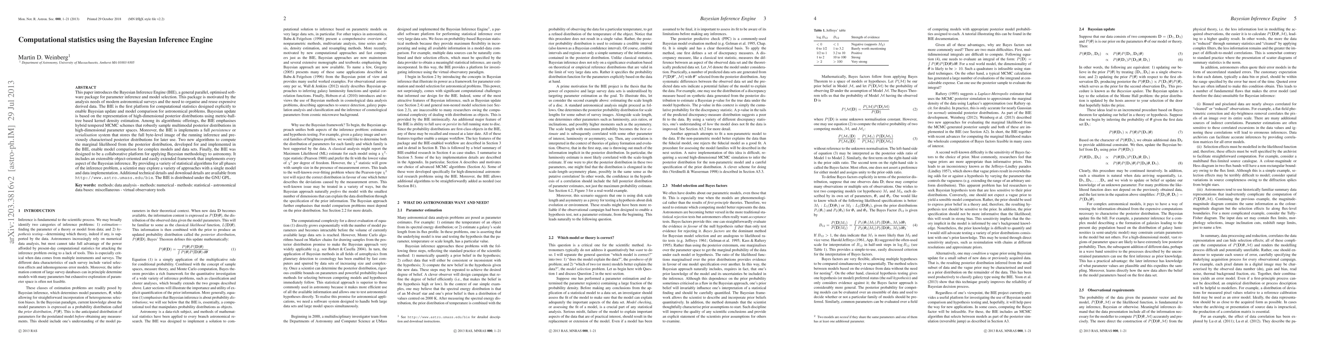 This paper introduces the Bayesian Inference Engine (BIE), a parallel software package for Bayesian parameter inference and model selection, particularly tailored for astronomical data analysis. It features hybrid MCMC schemes and a persistence system for storing inference results, along with new algorithms for model comparison.