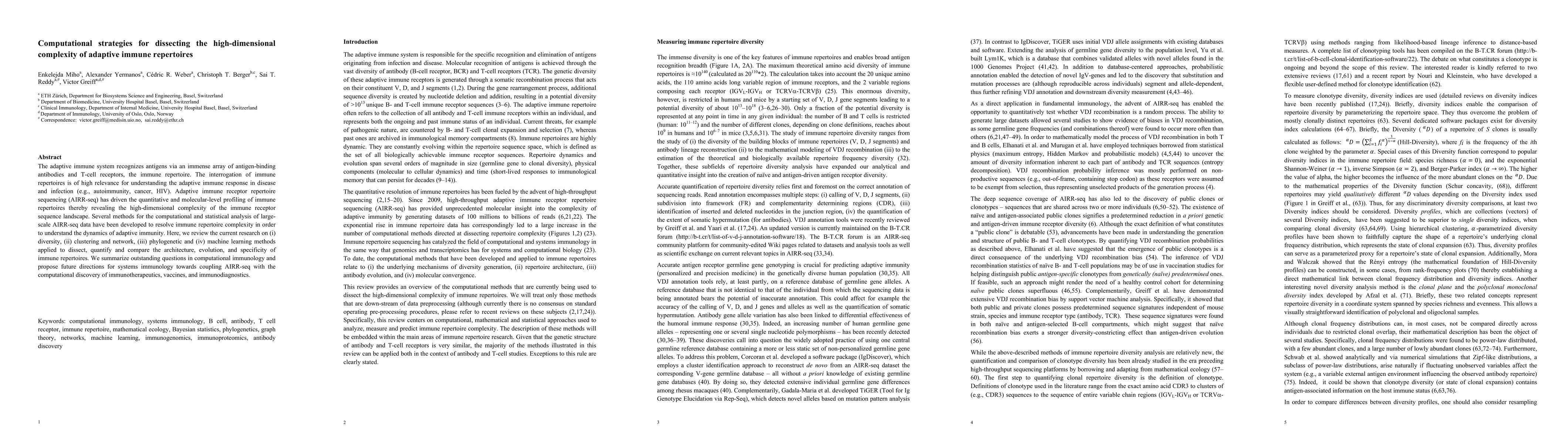 The paper provides a comprehensive review of computational, mathematical, and statistical methods for analyzing immune repertoires, discussing their underlying assumptions and limitations.