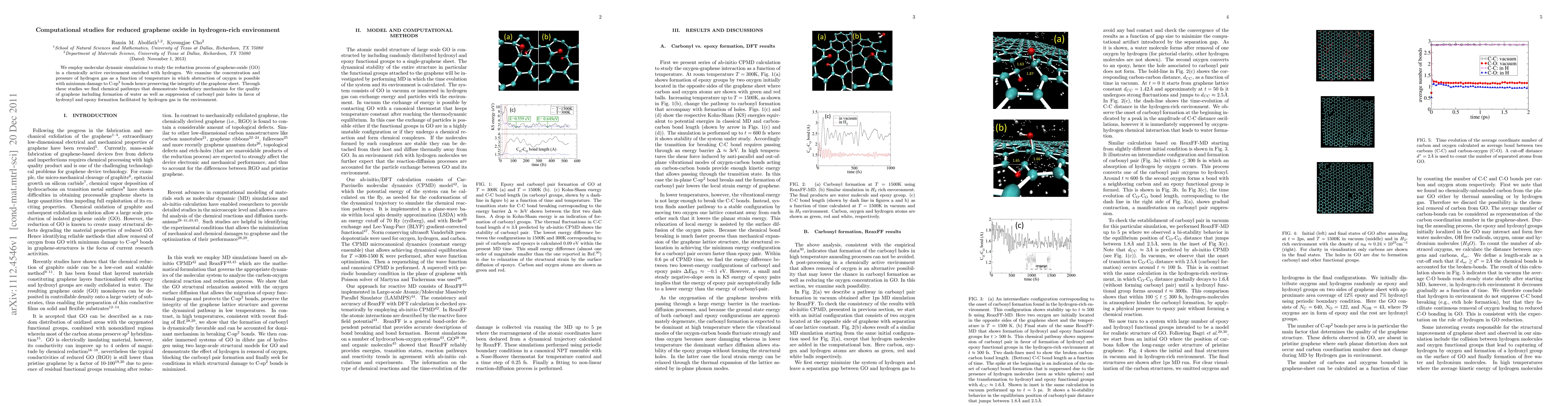 We employ molecular dynamic simulations to study the reduction process of graphene-oxide (GO) in a chemically active environment enriched with hydrogen. We examine the concentration and pressure of hydrogen gas as a function of temperature in which abstraction of oxygen is possible with minimum damage to C-sp$^2$ bonds hence preserving the integrity of the graphene sheet. Through these studies we find chemical pathways that demonstrate beneficiary mechanisms for the quality of graphene including formation of water as well as suppression of carbonyl pair holes in favor of hydroxyl and epoxy formation facilitated by hydrogen gas in the environment.