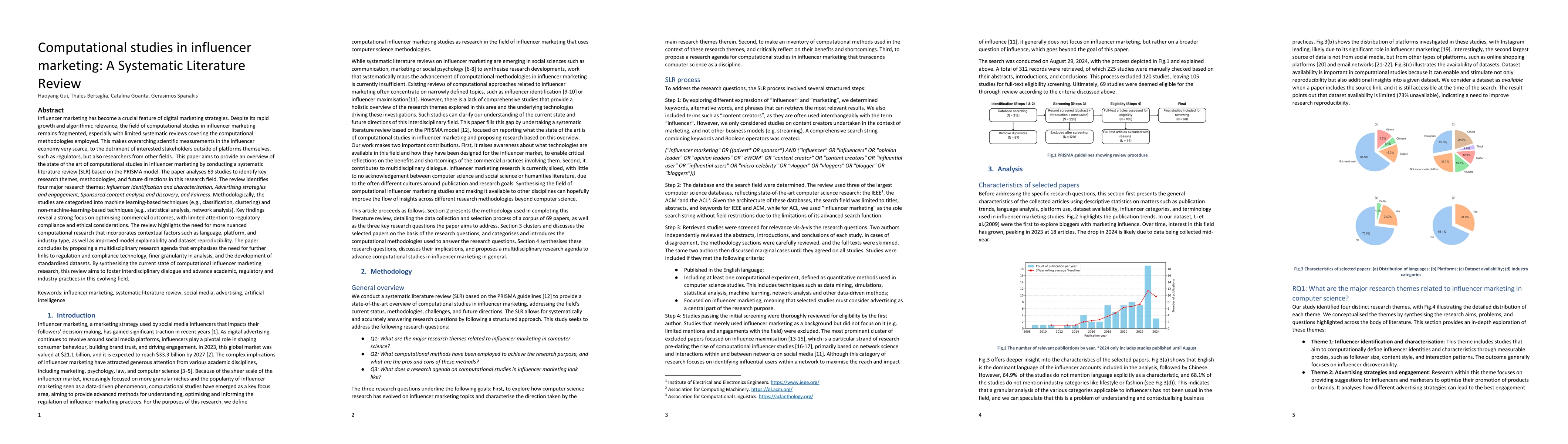 Influencer marketing has become a crucial feature of digital marketing strategies. Despite its rapid growth and algorithmic relevance, the field of computational studies in influencer marketing remains fragmented, especially with limited systematic reviews covering the computational methodologies employed. This makes overarching scientific measurements in the influencer economy very scarce, to the detriment of interested stakeholders outside of platforms themselves, such as regulators, but also researchers from other fields. This paper aims to provide an overview of the state of the art of computational studies in influencer marketing by conducting a systematic literature review (SLR) based on the PRISMA model. The paper analyses 69 studies to identify key research themes, methodologies, and future directions in this research field. The review identifies four major research themes: Influencer identification and characterisation, Advertising strategies and engagement, Sponsored content analysis and discovery, and Fairness. Methodologically, the studies are categorised into machine learning-based techniques (e.g., classification, clustering) and non-machine-learning-based techniques (e.g., statistical analysis, network analysis). Key findings reveal a strong focus on optimising commercial outcomes, with limited attention to regulatory compliance and ethical considerations. The review highlights the need for more nuanced computational research that incorporates contextual factors such as language, platform, and industry type, as well as improved model explainability and dataset reproducibility. The paper concludes by proposing a multidisciplinary research agenda that emphasises the need for further links to regulation and compliance technology, finer granularity in analysis, and the development of standardised datasets.