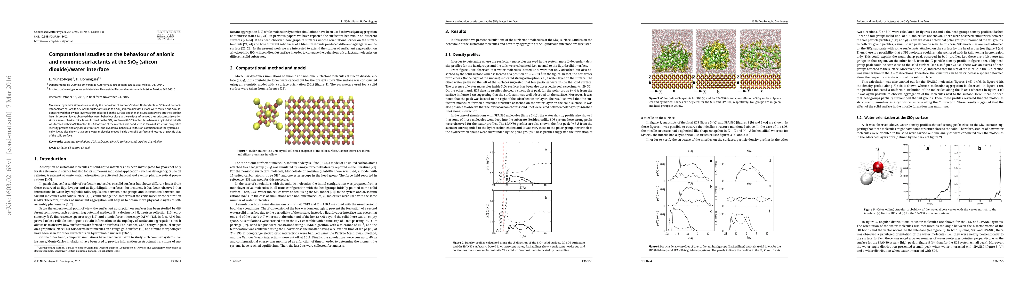 This study uses molecular dynamics simulations to investigate the adsorption behavior of anionic (SDS) and nonionic (SPAN80) surfactants at the SiO₂/water interface. Results show that surfactants attach after a water layer forms, leading to different micelle shapes and adsorption dynamics depending on the surfactant type.