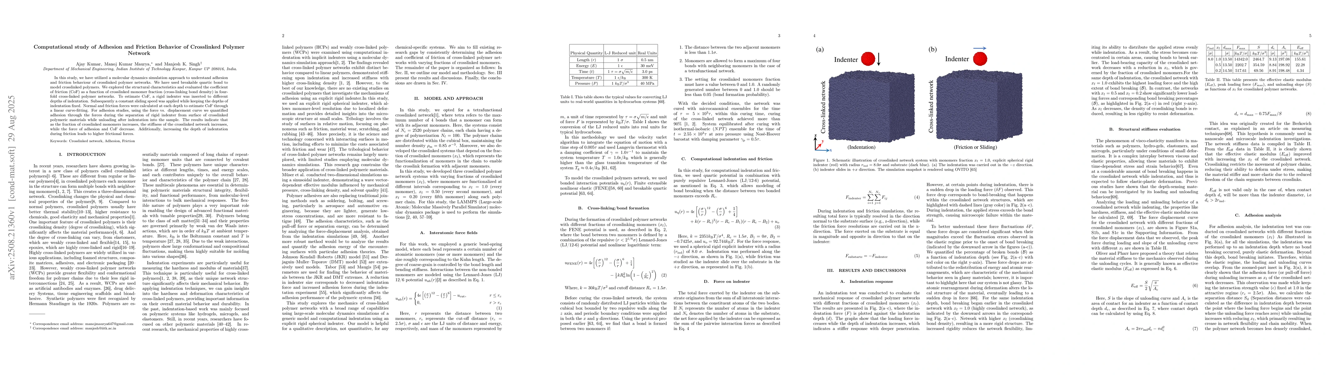 In this study, we have utilized a molecular dynamics simulation approach to understand adhesion and friction behaviour of crosslinked polymer networks. We have used breakable quartic bond to model crosslinked polymers. We explored the structural characteristics and evaluated the coefficient of friction (CoF) as a function of crosslinked monomer fraction (cross-linking bond density) in four-fold cross-linked polymer networks. To estimate CoF, a rigid indenter was inserted to different depths of indentation. Subsequently a constant sliding speed was applied while keeping the depths of indentation fixed. Normal and friction forces were calculated at each depth to estimate CoF through a linear curve-fitting. For adhesion studies, using the force vs. displacement curve we quantified adhesion through the forces during the separation of rigid indenter from surface of crosslinked polymeric materials while unloading after indentation into the sample. The results indicate that as the fraction of crosslinked monomers increases, the stiffness of the crosslinked network increases, while the force of adhesion and CoF decrease. Additionally, increasing the depth of indentation during friction leads to higher frictional forces.