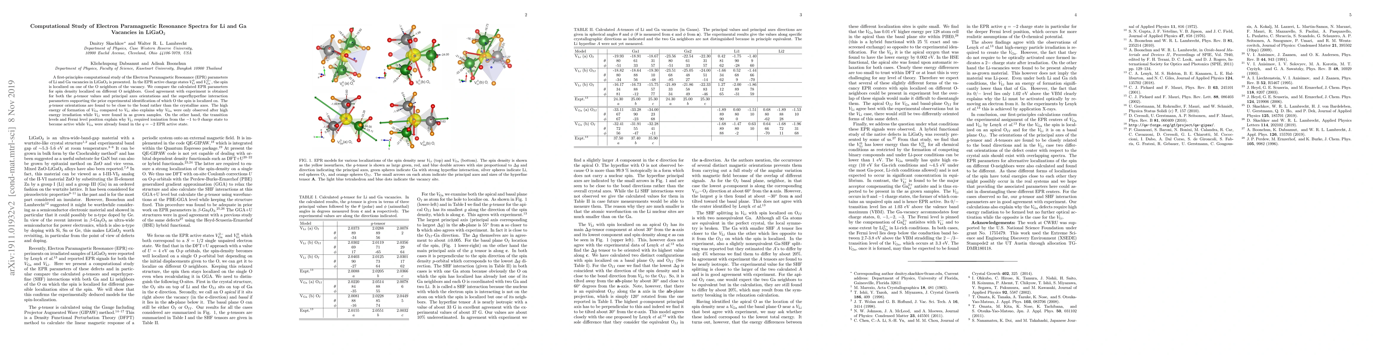 A computational study of the Electron Paramagnetic Resonance (EPR) $g$-tensors and hyperfine tensors of Li and Ga vacancies in LiGaO$_2$ is presented. Density Functinal Theory (DFT) calculations are carried out of the Ga and Li vacancies using the DFT+U approach in the charge states which carry an unpaired spin. In both vacancies the hole is located on one oxygen $p$-orbital adjacent to the vacancy. Apical and different basal plane O are considered. The magnetic resonance parameters of the defects are determined using the Gauge Including Projector Augmented Wave (GIPAW) method. The EPR spectra of $V_\mathrm{Ga}^{2-}$ is characterized by a quasi-isotropic superhyperfine (SHF) interaction with one Ga nucleus and for the apical O spin gives a $g$-tensor with maximum oriented along the bond direction from that O to its other Ga neighbor. For $V_\mathrm{Li}^0$ there is a quasi-isotropic SHF interaction with two Ga nuclei and the $g$-tensor maximum is along ${\bf c}$ for the basal plane O spin. Both of these are in agreement with experiment but we predict also the $g$-tensors for the other possible localization of the spins as well as the small hyperfine splittings (as yet not observed) on Li. The energies of formation and transition levels of the corresponding defects provide insight into the conditions required to activate these EPR spectra.