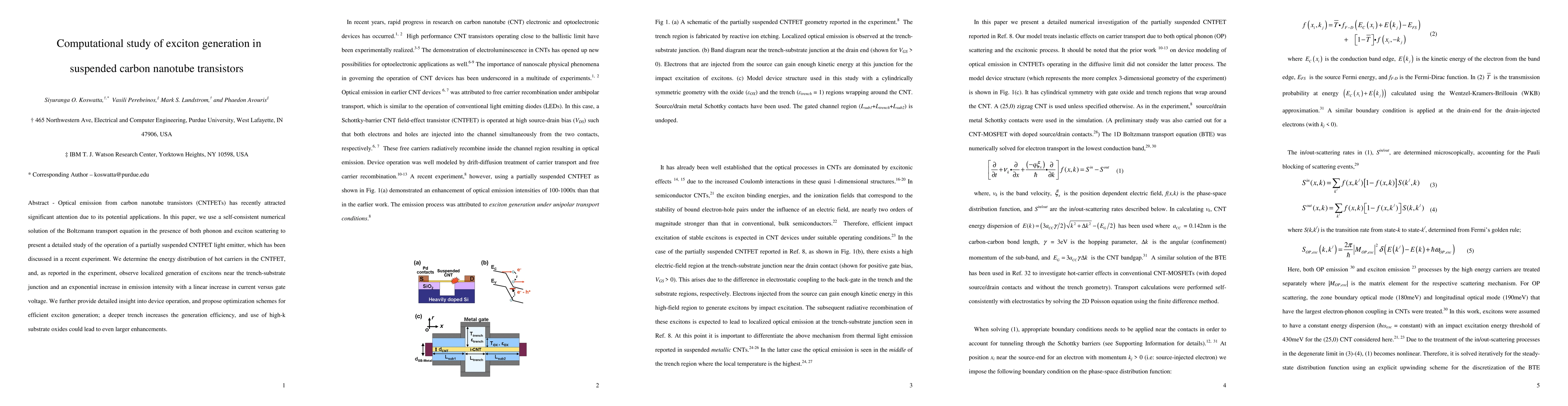 Optical emission from carbon nanotube transistors (CNTFETs) has recently attracted significant attention due to its potential applications. In this paper, we use a self-consistent numerical solution of the Boltzmann transport equation in the presence of both phonon and exciton scattering to present a detailed study of the operation of a partially suspended CNTFET light emitter, which has been discussed in a recent experiment. We determine the energy distribution of hot carriers in the CNTFET, and, as reported in the experiment, observe localized generation of excitons near the trench-substrate junction and an exponential increase in emission intensity with a linear increase in current versus gate voltage. We further provide detailed insight into device operation, and propose optimization schemes for efficient exciton generation; a deeper trench increases the generation efficiency, and use of high-k substrate oxides could lead to even larger enhancements.