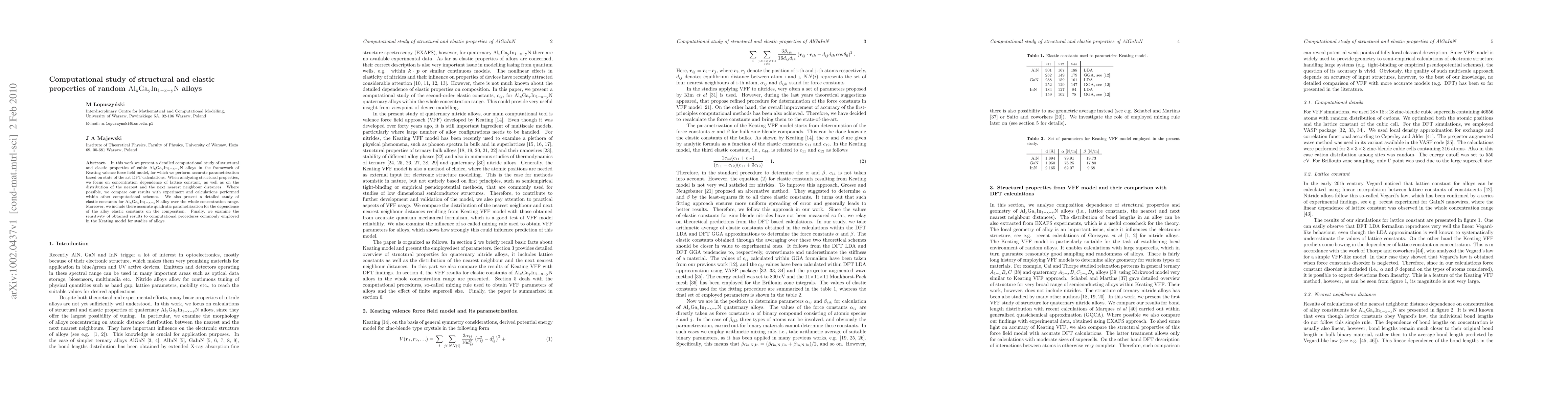 In this work we present a detailed computational study of structural and elastic properties of cubic AlGaInN alloys in the framework of Keating valence force field model, for which we perform accurate parametrization based on state of the art DFT calculations. When analyzing structural properties, we focus on concentration dependence of lattice constant, as well as on the distribution of the nearest and the next nearest neighbour distances. Where possible, we compare our results with experiment and calculations performed within other computational schemes. We also present a detailed study of elastic constants for AlGaInN alloy over the whole concentration range. Moreover, we include there accurate quadratic parametrization for the dependence of the alloy elastic constants on the composition. Finally, we examine the sensitivity of obtained results to computational procedures commonly employed in the Keating model for studies of alloys.