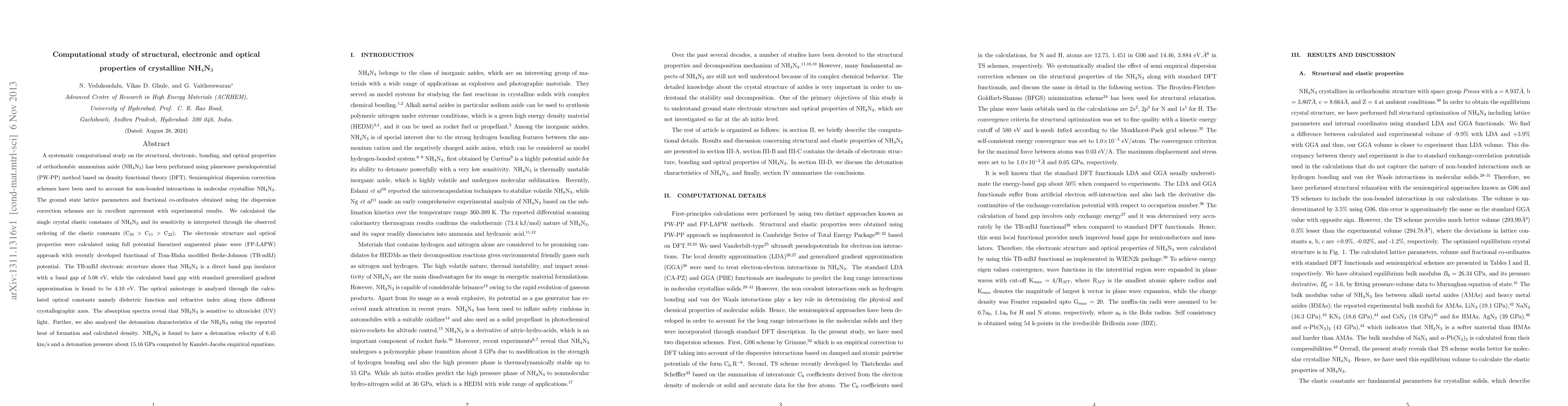 This computational study investigates the structural, electronic, and optical properties of crystalline ammonium azide (NH$_4$N$_3$) using DFT and TB-mBJ methods. The material is identified as a direct band gap insulator with a calculated band gap of 5.08 eV and shows sensitivity to UV light, with a detonation velocity of 6.45 km/s and pressure of 15.16 GPa.