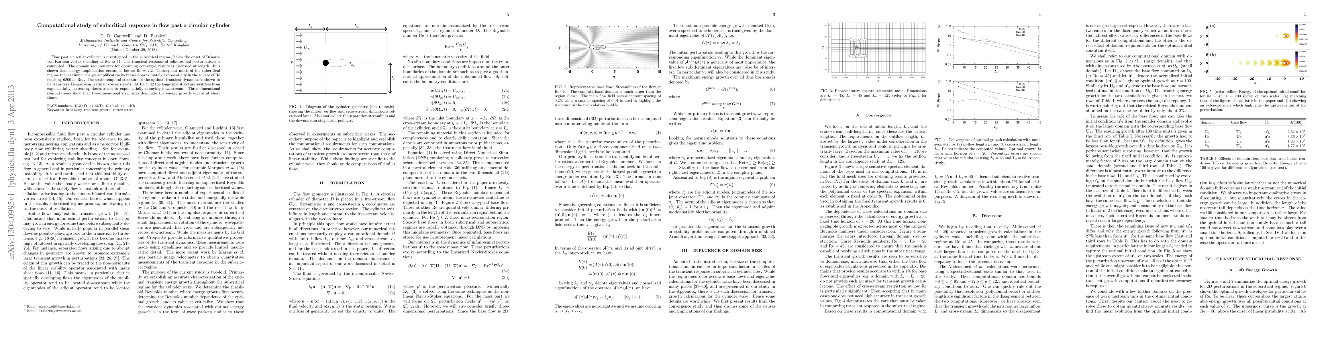 Flow past a circular cylinder is investigated in the subcritical regime, below the onset of Benard-von Karman vortex shedding at Re_c ~ 47. The transient response of infinitesimal perturbations is computed. The domain requirements for obtaining converged results is discussed at length. It is shown that energy amplification occurs as low as Re=2.2. Throughout much of the subcritical regime the maximum energy amplification increases approximately exponentially in the square of Re reaching 6800 at Re_c$. The spatiotemporal structure of the optimal transient dynamics is shown to be transitory Benard-von Karman vortex streets. At Re ~ 42 the long-time structure switches from exponentially increasing downstream to exponentially decaying downstream. Three-dimensional computations show that two-dimensional structures dominate the energy growth except at short times.