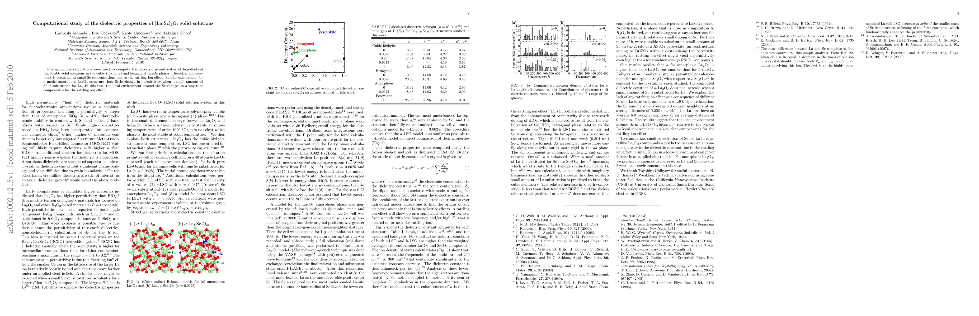 First-principles calculations were used to compute the dielectric permittivities of hypothetical [La,Sc]2O3 solid solutions in the cubic (bixbyite) and hexagonal La2O3 phases. Dielectric enhancement is predicted at small Sc concentrations due to the rattling ion effect. Similar calculations for a model amorphous La2O3 structure show little change in permittivity when a small amount of Sc is substituted for La. In this case, the local environment around the Sc changes in a way that compensates for the rattling ion effect.