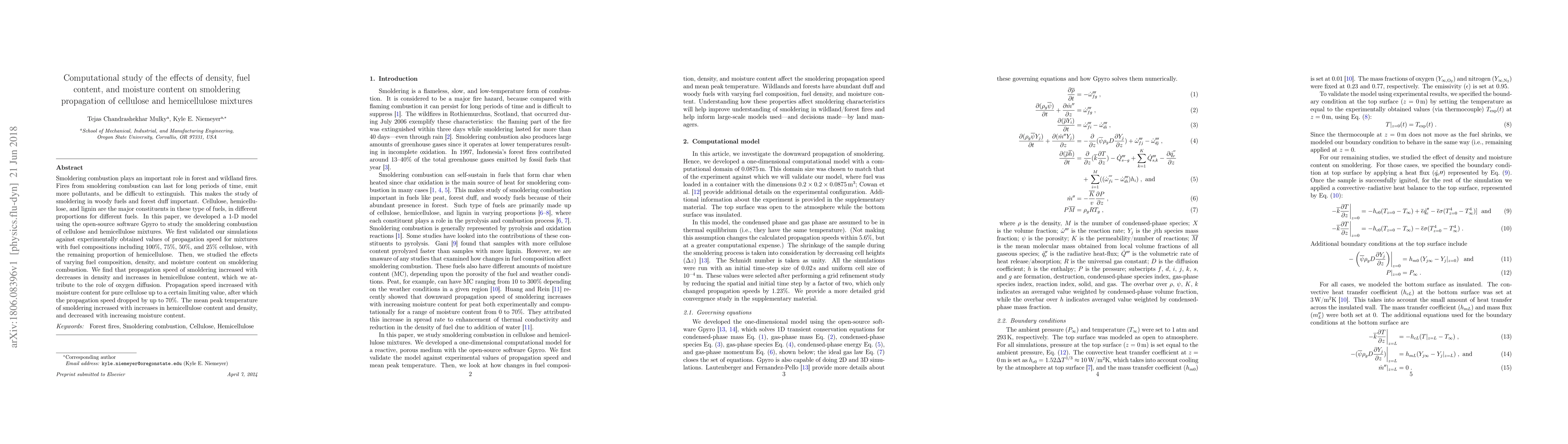 This paper develops a 1-D model to study the smoldering combustion of cellulose and hemicellulose mixtures, finding that propagation speed increases with lower density and higher hemicellulose content, while moisture content initially boosts but later drastically reduces propagation speed. The mean peak temperature rises with higher hemicellulose content and density but falls with increased moisture.