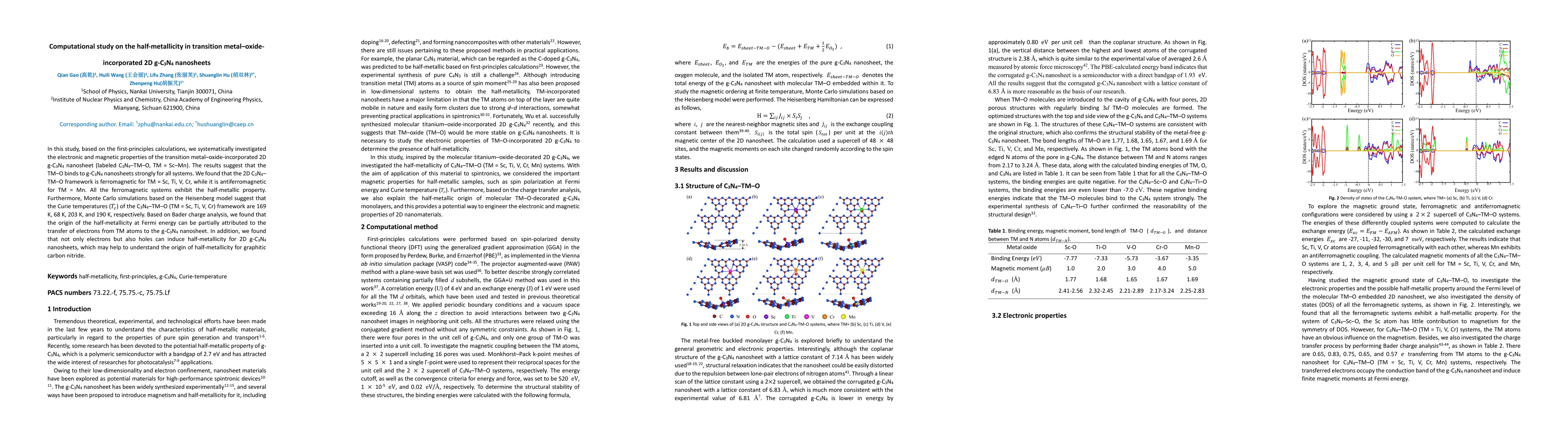 This study investigates the electronic and magnetic properties of transition metal-oxide-incorporated 2D g-C3N4 nanosheets using first-principles calculations. The results show that all systems exhibit strong binding and half-metallicity in ferromagnetic systems for TM = Sc, Ti, V, Cr, while TM = Mn is antiferromagnetic.
